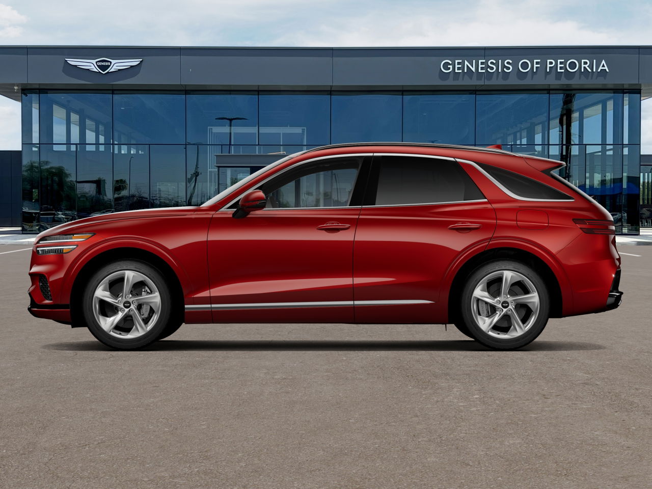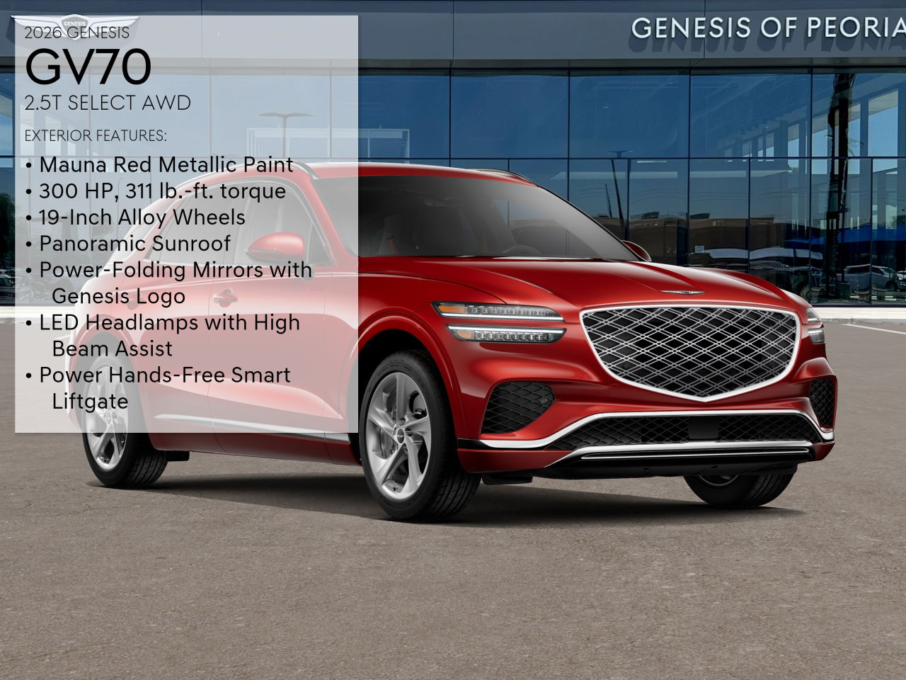 The 2026 Genesis GV70 2.5T Select AWD is a new SUV in transit to Genesis of Peoria. It features a Mauna Red exterior and a Vanilla Beige/Obsidian Black interior. The vehicle is equipped with a turbocharged engine, all-wheel drive, and a range of advanced safety and convenience features. Real Pricing is offered with a variety of payment options and approvals available.
