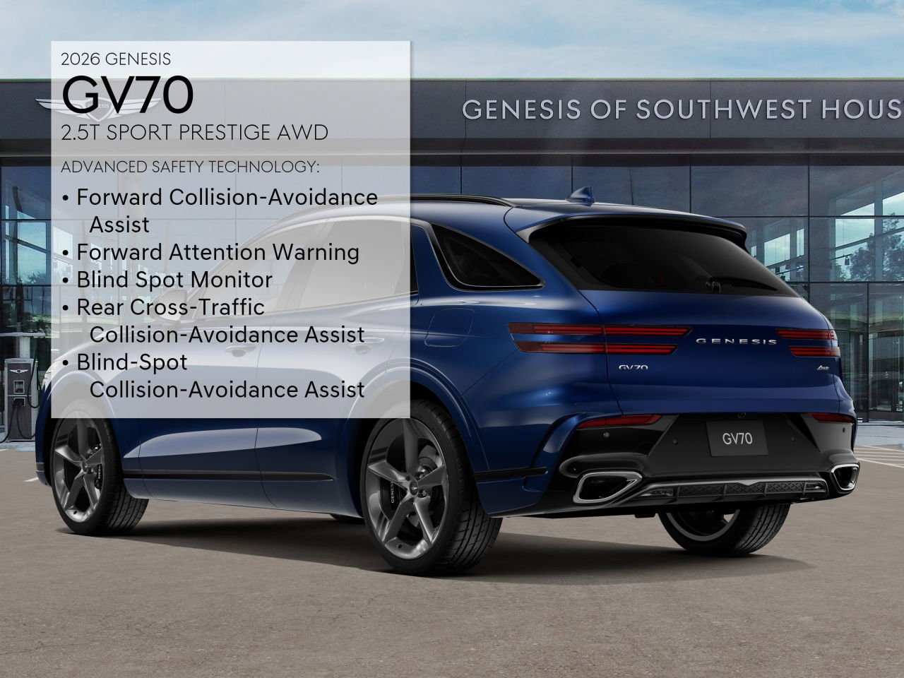 The 2026 Genesis GV70 2.5T Sport Prestige AWD offers a blend of luxury, performance, and advanced technology. With a turbocharged 2.5L engine, all-wheel drive, and a host of premium features, this sport utility vehicle is designed for both comfort and dynamic driving. The spacious interior features Obsidian Black sport leather seating surfaces, advanced navigation, and a Bang & Olufsen sound system, while the exterior is finished in Capri Blue with LED headlights and a panoramic sunroof. Safety and convenience are prioritized with features like adaptive cruise control, blind spot monitoring, and a suite of driver assistance systems.