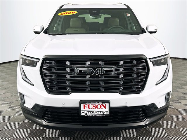 Glacier White Tricoat 2026 GMC Acadia Denali Ultimate AWD 8-Speed Automatic 2.5L DOHC AWD, Woodland Mahogany Leather. Lowest prices in the Wabash Valley. Recent Arrival!