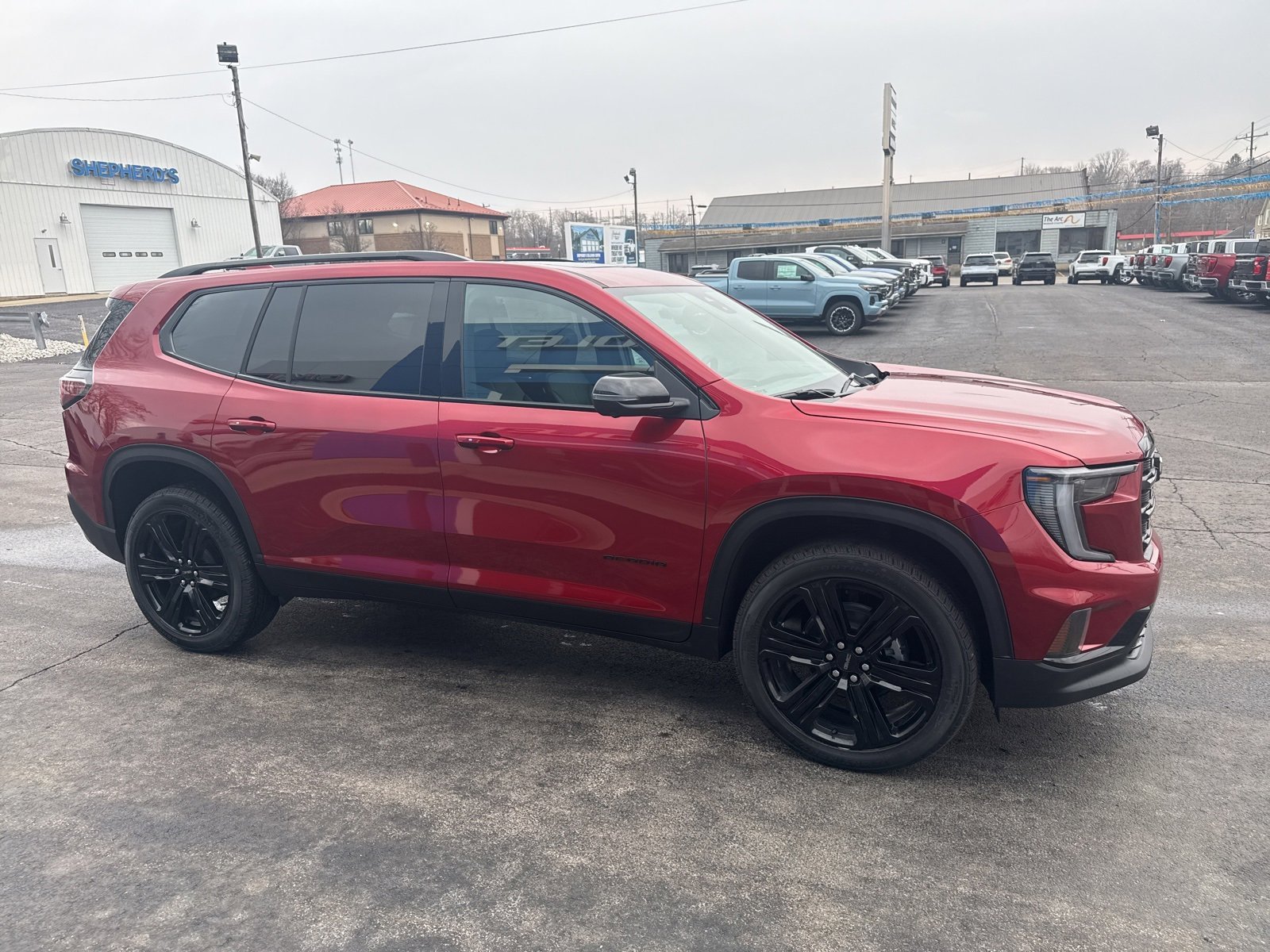 2026 GMC Acadia Volcanic Red Elevation FWD 8-Speed Automatic 2.5L DOHC FWD, After Dark Cloth. 20/26 City/Highway MPG.