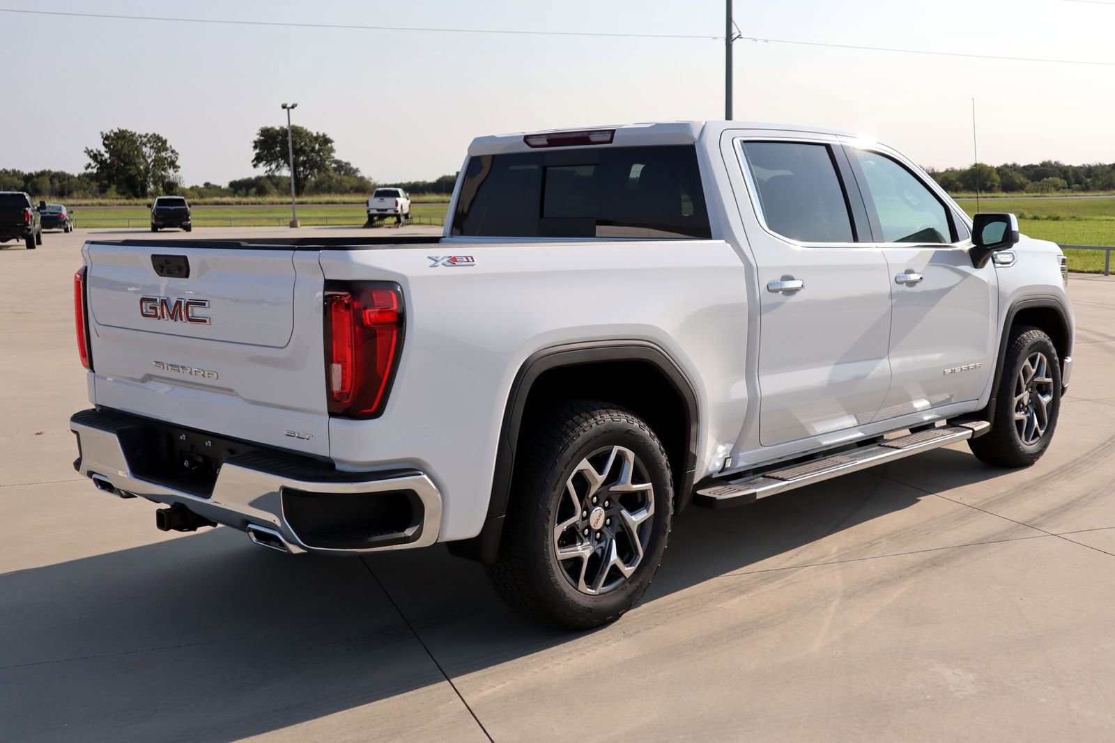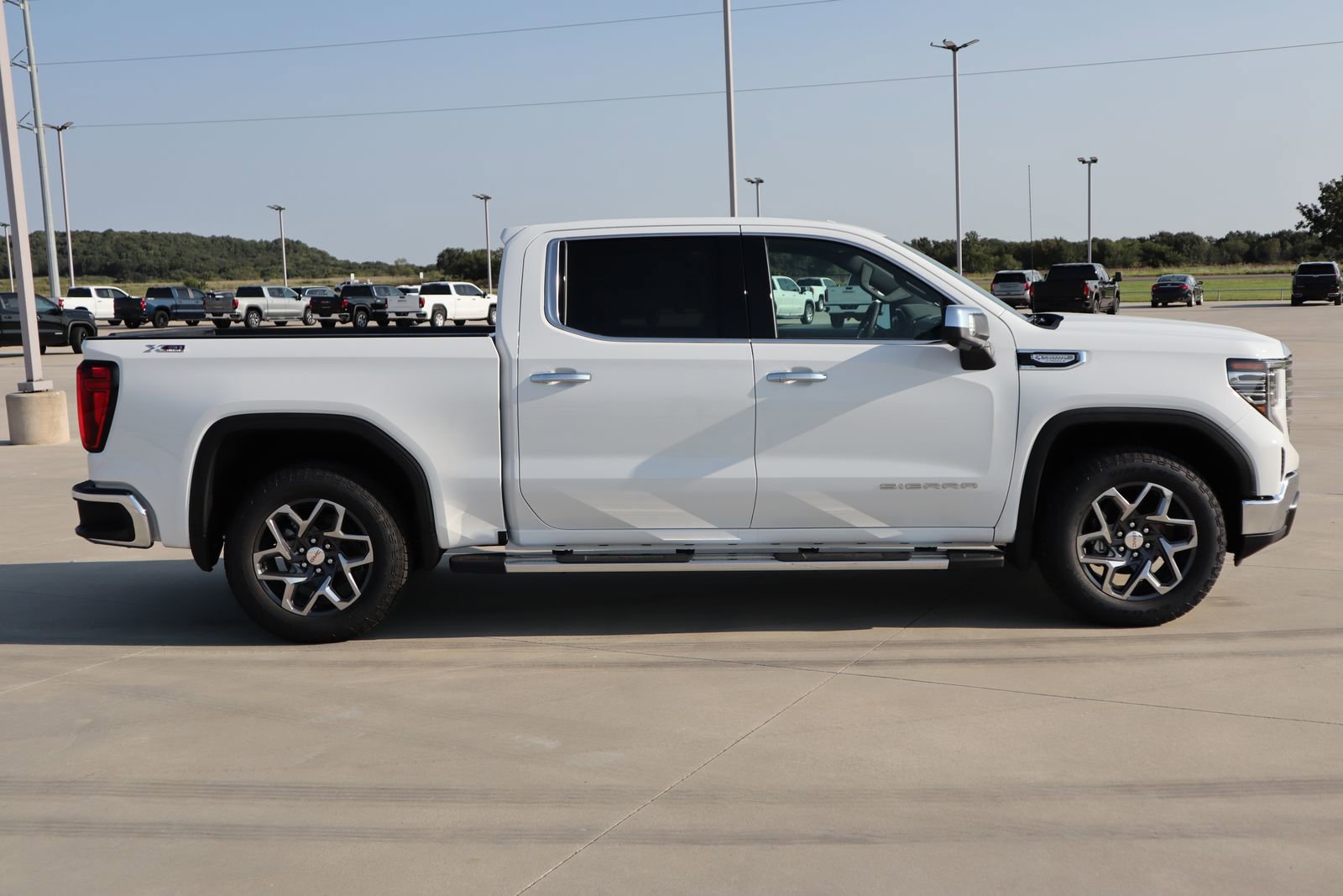 Summit White 2026 GMC Sierra 1500 SLT 4WD 10-Speed Automatic, 4WD, Dark Walnut/Slate interior. The vehicle features a 3.0L Gasoline engine paired with a 10-speed automatic transmission and features a quiet cabin with a full-size display. The vehicle is equipped with a full-size of the new technology.