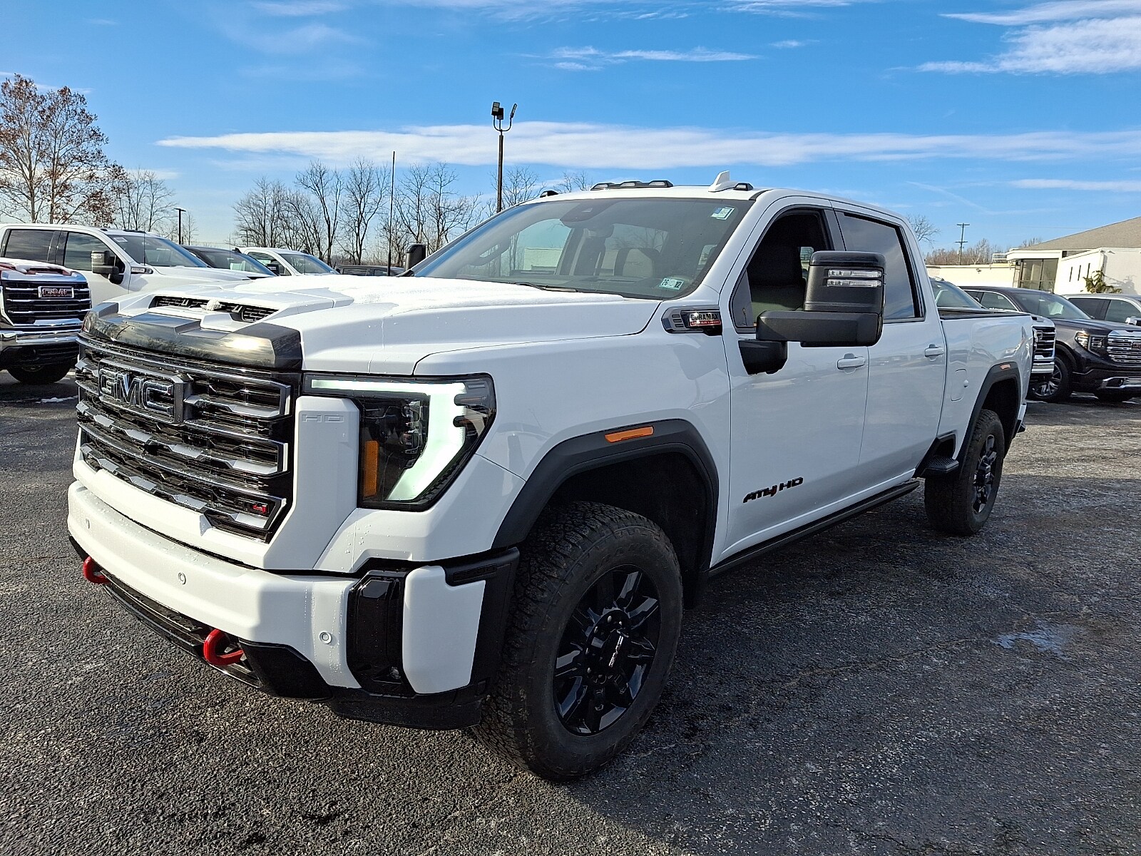 The 2026 GMC Sierra 2500HD AT4 Crew Cab, Standard Bed, features a Duramax 6.6L V-8 diesel direct injection, intercooled turbo, diesel engine with 470HP. This truck is equipped with a 10-speed automatic transmission and four-wheel drive. The Summit White exterior is complemented by a Jet Black interior with Kalahari accents. This Sierra 2500HD is designed for both work and comfort, offering advanced technology, premium leather upholstery, and a suite of safety features.