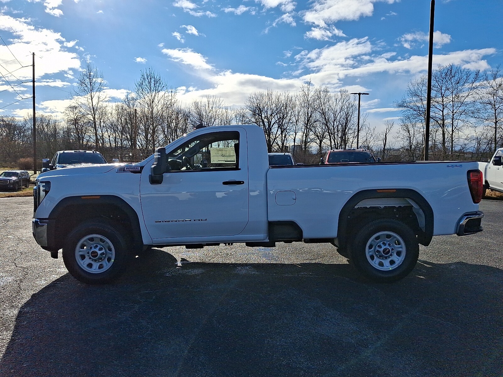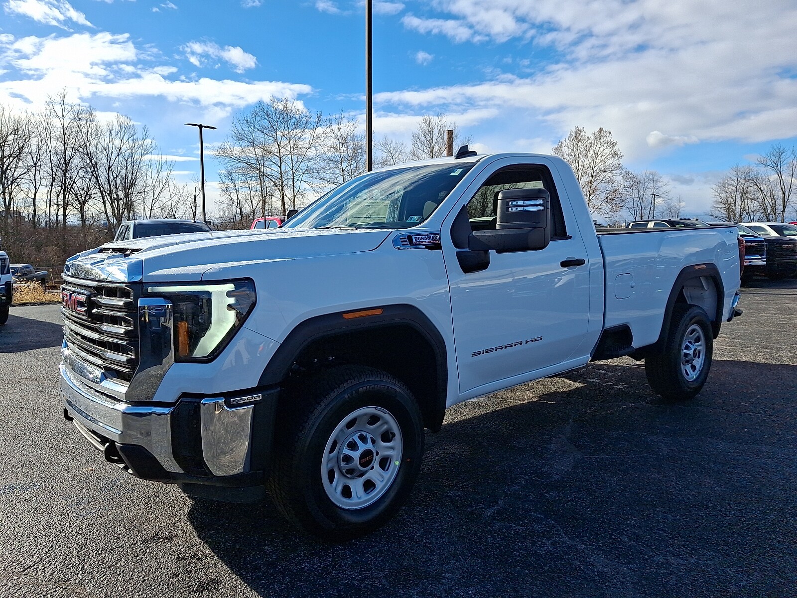 The 2026 GMC Sierra 2500HD Regular Cab, Long Bed, Pro, 4WD features a Heavy-Duty 80 Amp Battery and a Duramax 6.6L Turbo-Diesel V8 Engine. This truck is equipped with a range of convenience and safety features, making it a solid choice for those needing power and capability in a diesel engine. The Summit White exterior is complemented by a Jet Black interior, and the truck's automatic transmission and four-wheel drive make it ready for work or play.