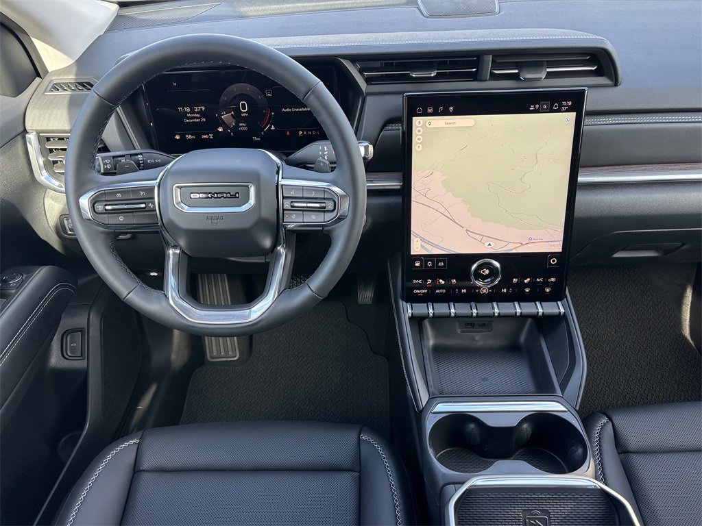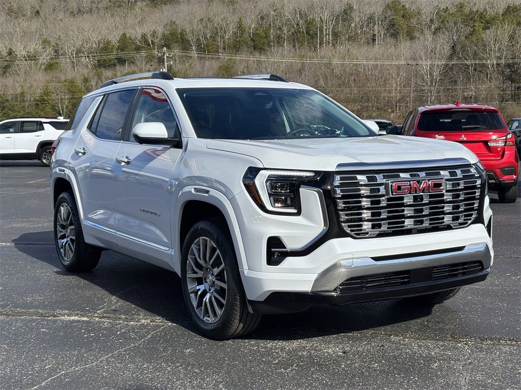 The 2026 GMC Terrain Denali offers a blend of luxury and performance with its 1.5L Turbo 4-cylinder engine and all-wheel drive capability. The interior features After Dark perforated leather-appointed seat trim, a panoramic sunroof, and advanced technology including the GMC Premium Infotainment System with Google built-in. Safety and convenience are enhanced with features like Adaptive Cruise Control, Lane Keep Assist, and a heated steering wheel. The Glacier White Tricoat exterior complements the vehicle's refined appearance.
