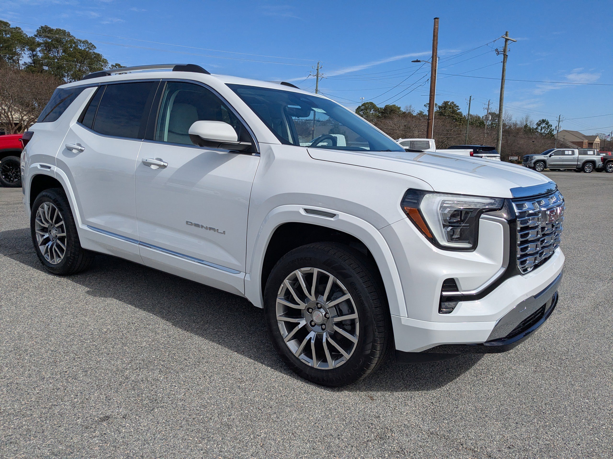 The 2026 GMC Terrain Denali offers a smooth and connected ride with its all-wheel drive system and 1.5L Turbo 4-cylinder engine paired to an 8-speed automatic transmission. The interior features light ash gray with a very dark atmosphere, perforated leather-appointed seat trim, and advanced technology including a multi-color digital high-contrast display, Google built-in compatibility, and wireless Apple CarPlay and Android Auto. Safety and convenience are prioritized with features like adaptive cruise control, lane keep assist, rear park assist, and a heated steering wheel. The Summit White exterior adds a sporty touch.