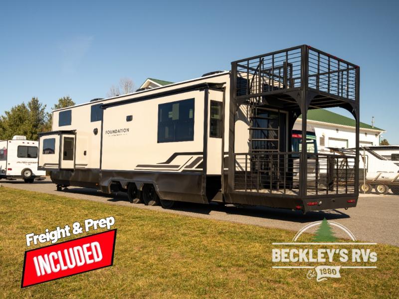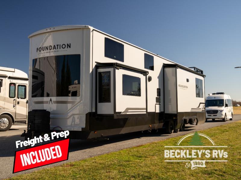 Grand Design Foundation destination trailer 42GD highlights: Lofted Deck, Large Kitchen Island, King Bed Slide Out, Two Awnings, Loft with Queen-Size Sleeping Pad. You'll fall in love with this spacious destination trailer that can sleep six each night! With dual entry doors, you can enter in through the rear deck that includes a lower level for gathering, and an observation deck to take in the stars! The other entry door leads into the combined kitchen and living room that includes a spacious kitchen island with a dishwasher, a pull-out pantry, an 18.6 cu. ft. refrigerator and an L-shaped sofa with a trundle bed. There is also an entertainment wall with smart storage and sliding doors that go out to the rear deck. A set of stairs leads to the loft with a queen-size sleeping pad, ample storage space, plus a table with a foot nook so you can put the table away when not in use. Back downstairs, a full bath will let you freshen up each day and a front private bedroom with a king bed slide is sure to bring comfort. There is also storage space for your things, a telescoping TV, plus washer and dryer prep if you plan to add these appliances! With any Foundation destination trailer by Grand Design, you can choose to stay longer surrounded by residential inspired features! The durable construction includes aluminum framing with a temperature-controlled fiberglass laminated wall, composite exterior decking with waterproof woven vinyl flooring, quad seal protection, and an industry-leading maintenance-less one-piece roof with composite roof decking panels. There is also an exterior convenience center, brass plumbing fittings, an 8' 5" wide body frame, and sleek bonded square glass windows. The interior is packed with residential features, including GE appliances, motorized shades in the living room and kitchen, solid surface countertops in the kitchen and bath, and the list goes on!