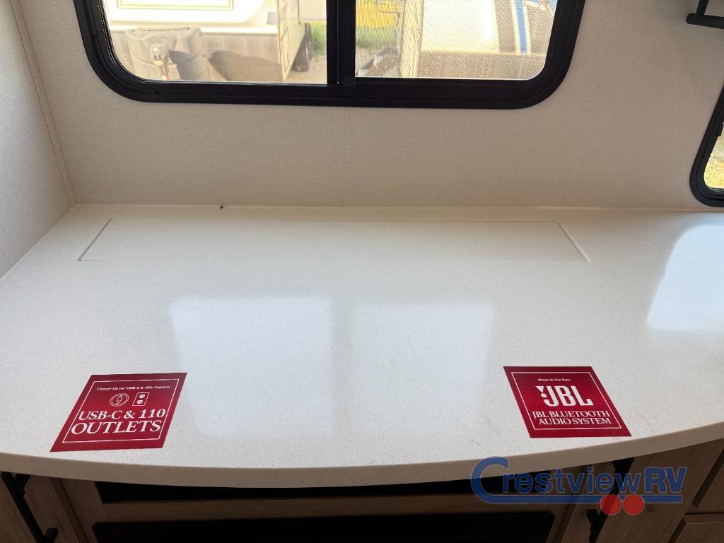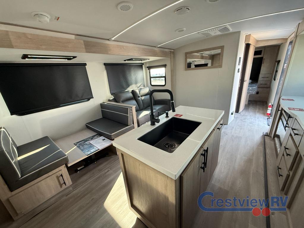 Grand Design Imagine travel trailer 2670MK highlights: With this Imagine travel trailer, you can work while you're on the road because it offers you a desk in the main living area. You won't have to miss out on the action since you'll be right next to the booth dinette and tri-fold sofa, and there is even a pantry directly to the left of the desk for you to grab a quick snack while you're working. Once you're done with work, you can relax on the tri-fold sofa while you watch the telescoping TV, and the private bedroom offers you a 60" x 80" queen bed to rest on when you're ready to call it a night. Just imagine leaving the world behind and secluding yourself away with your favorite people in your Grand Design Imagine travel trailer! The Imagine has been designed to enjoy camping and includes a high-capacity furnace, a heated and enclosed underbelly with suspended tanks, a designated heat duct to the subfloor, and a high-density roof insulation with attic vent. You'll have a large panoramic window to let natural lighting in and an adjustable Power Awning with LED Lights for those night gatherings. The exclusive drop-frame pass-through storage compartment is going to allow you to bring along lots of equipment, and the universal docking station is an all-in-one location for utilities and hook-ups. You'll also have oversized tank capacities so that you can fill and empty your tanks less often.
