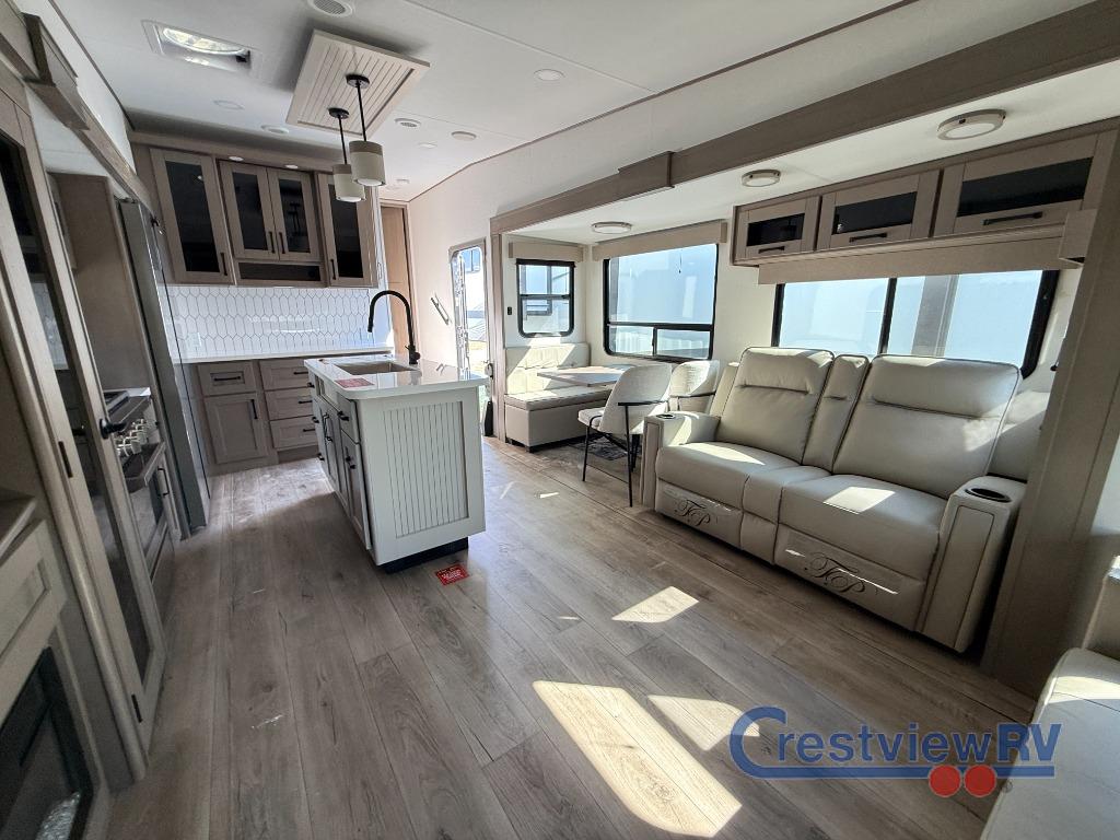Grand Design Reflection fifth wheel 303RLS highlights: Rear Tri-Fold Sofa. Whether you travel for pleasure or work, you will love the spacious main living and kitchen area with a rear tri-fold sofa that doubles as extra sleeping space, and the theater seating directly across from the entertainment center with a 40" LED HDTV and a fireplace below. The kitchen island will make meal prepping and drying the dishes easier and the hutch is the perfect place to place your picture frames, nice dishes, and extra cooking items. There is even a pantry that is big enough to store all of your favorite snacks, dry ingredients and such. Outside you can enjoy two electric awnings that provide protection from the elements as you relax and visit with other RVers, and your camping chairs can easily be stored in the pass-through compartment. The double entry bathroom is convenient especially at night when you can slide the door to enter from the front master bedroom. You will find plenty of storage for your clothing and gear, plus the bedroom slide out gives you drawers and linen storage that stretches into the full bathroom. With any Reflection fifth wheel by Grand Design, you will have a solar panel for off-grid camping and a 60 amp charge controller and inverter prep, a Universal All-In-One docking station, an unobstructed pass-through storage, and Goodyear Endurance tires. Each is constructed of gel coat exterior sidewalls, residential 5" truss rafters, walk-on roof decking, a fiberglass and radiant foil roof and front cap insulation plus laminated aluminum framed side walls, roof and end walls in slide rooms. Head inside to enjoy residential hardwood cabinet doors, premium Congoleum flooring, a spacious shower with a glass door, and many more comforts!