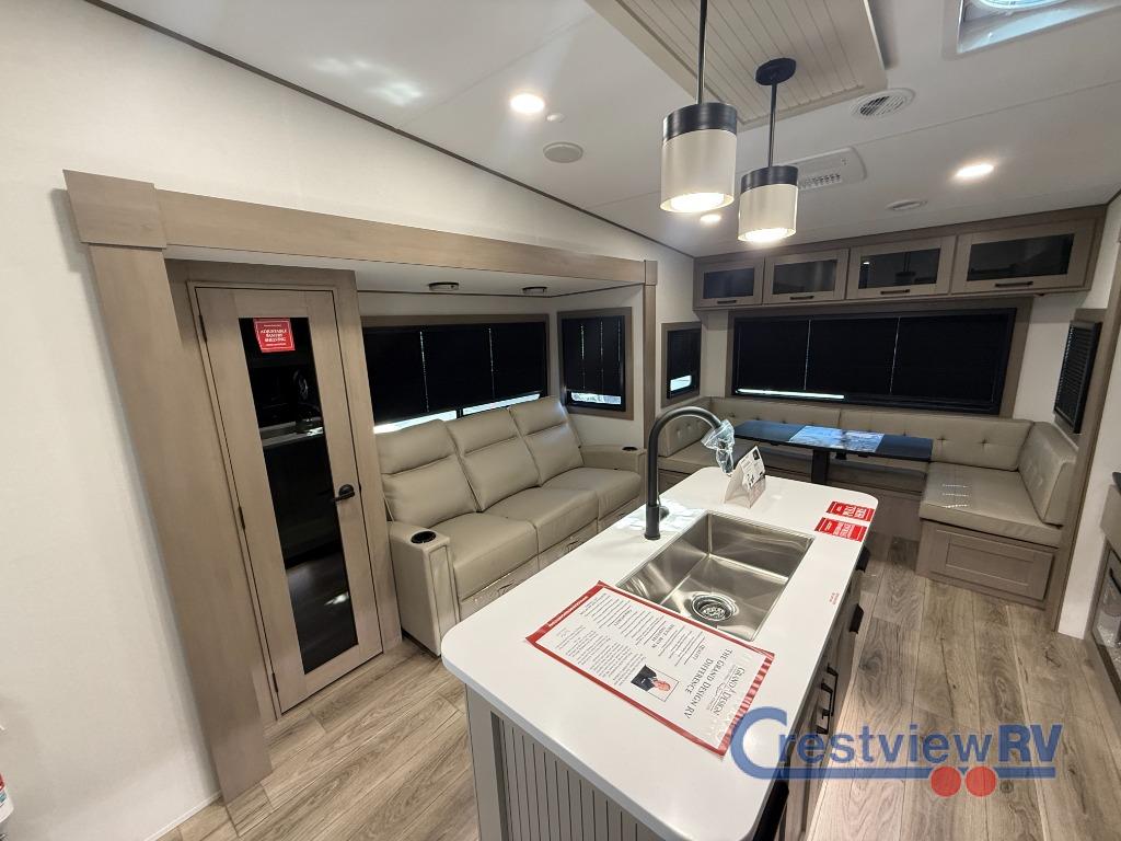 Grand Design Reflection fifth wheel. The middle bunk is a slide out with a great name for the bunks. The U-shaped lounge provides plenty of seating on the theater seats. The kitchen island gives the cook more space to make and serve meals, and the gourmet kitchen includes a 16-cu. ft. refrigerator, plus a pantry for dry goods. There is an exterior outside kitchen with a griddle and a 1.6 cu. ft. refrigerator for beverages and such, plus you will find an LP quick connect, Coax TV hookup, and a spray port to wash off your dirty shoes. Head inside to enjoy residential hardwood cabinet doors, premium Congoleum flooring, a spacious shower with a glass door, and many more comforts!