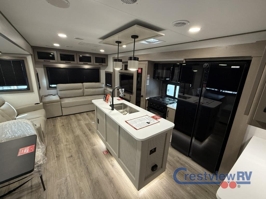 Grand Design Reflection travel trailer 345RLTS highlights: Kitchen Island, Theater Seating, Queen Bed Slide, Booth Dinette, Two Power Awnings. This rear living travel trailer will be perfect for extended stays at the campground or quick weekend trips to the lake! Once you've unloaded your gear from the pass-thru storage, head inside to relax on the rear tri-fold sofa with an adjustable headrest or on the theater seating across from the 40" TV and fireplace. There is also a booth dinette where you can dine together, or you can choose the optional swivel dinette. The spacious kitchen island will make mealtime easier than ever, plus there is a pantry and 16 cu. ft. 12V refrigerator for food storage. The full bath is right next to the front private bedroom for easy nighttime use, and speaking of nighttime, you're sure to sleep soundly on the queen bed slide. There is also a large front closet, TV prep, plus washer and dryer prep if you choose to add these appliances. With any Reflection travel trailer by Grand Design, you will have a solar panel for off-grid camping and a 60-amp charge controller and inverter prep, a Universal All-In-One docking station, and Goodyear Endurance tires. Each is constructed of gel coat exterior sidewalls, residential truss rafters, walk-on roof decking, a fiberglass and radiant foil roof and front cap insulation plus laminated aluminum framed side walls, roof and end walls in slide rooms. Head inside to enjoy residential hardwood cabinet doors, premium Congoleum flooring, a spacious shower with a glass door, and many more comforts!