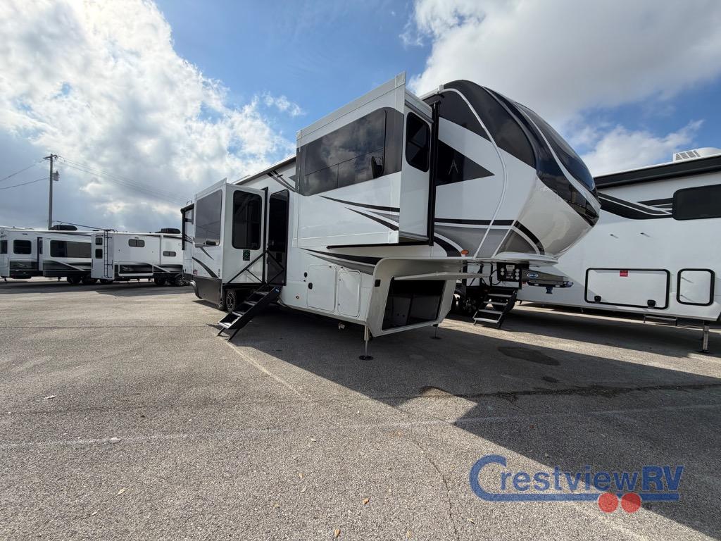 Grand Design Solitude fifth wheel 380FL highlights: Dual-Sink Vanity, Full and Half Bath, Separate Front Living Area, Kitchen Island, Exterior Sliding Tray. Each Solitude fifth wheel by Grand Design features a 101" wide-body construction, heavy duty 8,000 lb. axles, frameless tinted windows, and high-gloss gel coat sidewalls. You can camp during harsh weather thanks to the Weather-Tek Package that includes a 35K BTU high-capacity furnace, an all-in-one enclosed and heated utility center, and a fully enclosed underbelly with heated tanks and storage. Inside, you'll love the premium roller shades, hardwood cabinet doors, solid surface countertops, plus residential finishes throughout to make you truly feel at home. Each model also includes a MORryde CRE3000 suspension system, and a MORryde pin box that will provide smooth towing from home to campground. Affordable luxury is possible with the Solitude fifth wheels; choose yours today!
