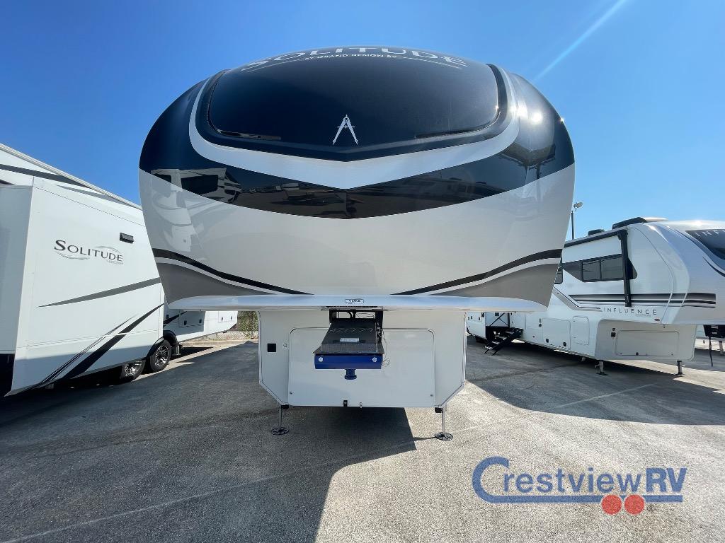 Grand Design Solitude fifth wheel 417KB highlights: Rear Kitchen, LED TV and Fireplace, Master Bedroom, Bath and a Half, Free-Standing Dinette, Theater Seating. The Solitude features a 101" wide-body construction, heavy duty 8,000 lb. axles, frameless tinted windows, and high-gloss gel coat sidewalls. Each model includes a MORryde CRE3000 suspension system, self adjusting brakes, and a MORryde pin box that will provide smooth towing from home to campground. Affordable luxury is possible with the Solitude fifth wheels; choose yours today!