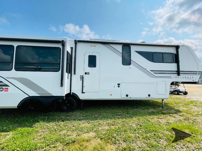 Grand Design Influence fifth wheel 3503GK highlights: Private Bedroom, Fireplace, Kitchen Island, Free Standing Dinette, Pass-Through Storage. A perfect couples coach featuring triple slides and a tri-fold sofa just in case you want to have overnight guests! You will love the spacious interior thanks to the dual opposing slides in the main living and kitchen area. Here you will find a kitchen island in the center and plenty of seating with a free standing dinette, theater seating for movie night opposite the fireplace and entertainment center, as well as a tri-fold sofa. The kitchen offers all of the amenities just like home, a 16 cu. ft. 12-volt refrigerator for your perishables, and a pantry and hutch nearby for dry goods and dishes. There is even a pet dish under the refrigerator for your furry friends. The center island offers added counter space and a sink for dishes and prep work. Head up the steps to your private front bedroom with queen bed slide, and bathroom with dual entry. You even have washer/dryer prep in case you wish to add the units and enjoy even more at-home conveniences! Any Grand Design Influence fifth wheel features five-sided aluminum cage construction with a walk-on roof and a fully enclosed underbelly with heated tanks and storage for all weather camping. For peace of mind, the MORryde CRE3000 Suspension system will provide safe and smooth towing, and the 101" widebody construction offers all the room you need and that is before multiple slides are fully engaged. You will appreciate the Keyed-Alike locks, slam-latch baggage doors with magnetic door catches, exterior security light, and SolidStep entry steps. On the inside, Congoleum flooring, premium roller shades for privacy, a hallway handrail for safety, and nightstands with USB ports to keep all of your electronics fully charged. You will also love the On Demand tankless water heater when showering, plus the added heat and ambiance from an electric fireplace, and so much more!