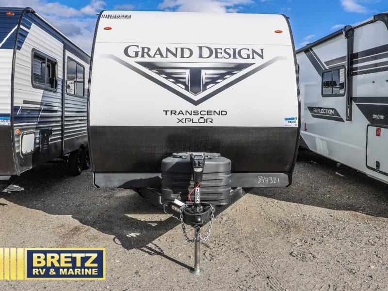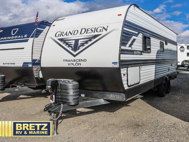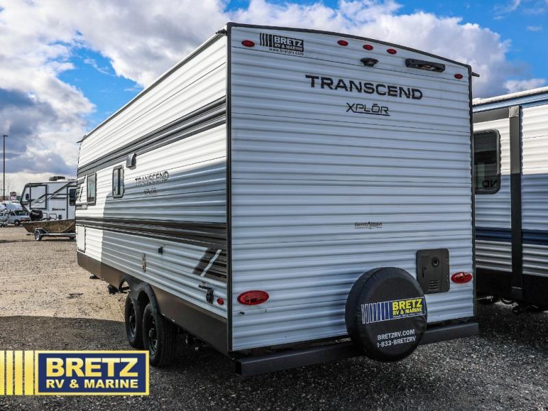 The options and features listed can vary and are based on manufacturer data when built. For an accurate list please contact the dealer. See disclaimer at the bottom of page. Grand Design Transcend Xplor travel trailer 19BHX highlights: Double-Size Bunks, Pass-Thru Storage, Walk-Around Queen Bed, Pantry. Camping trips are made complete in this travel trailer that can sleep seven each night! The little ones or your guest will love sleeping on the double-size bunks, while you take the queen bed in the front semi-private bedroom with a privacy curtain. A three-burner range and microwave oven will let you make meals each day, and a booth dinette provides a place to dine together. There are also convenient features found here, such as a pull-out pet dish and pull-out trash can, and there is ample storage space for your belongings. You will also appreciate the full bath that will let you stay clean throughout your trip without having to leave your trailer! The customer-focused, quality-built Transcend Xplor travel trailers by Grand Design are your ticket to fun and adventure. You will appreciate the power tongue jack when it comes time to set up, as well as the all-in-one utility center and the detachable power cord with an LED light. These models include many outlets throughout, USB ports to charge your gadgets, and a JBL exterior speaker to listen to your favorite tunes. The interior of the Transcend Xplor will have you feeling right at home with upgraded residential furniture, residential countertops, residential cabinet doors, and the list goes on!