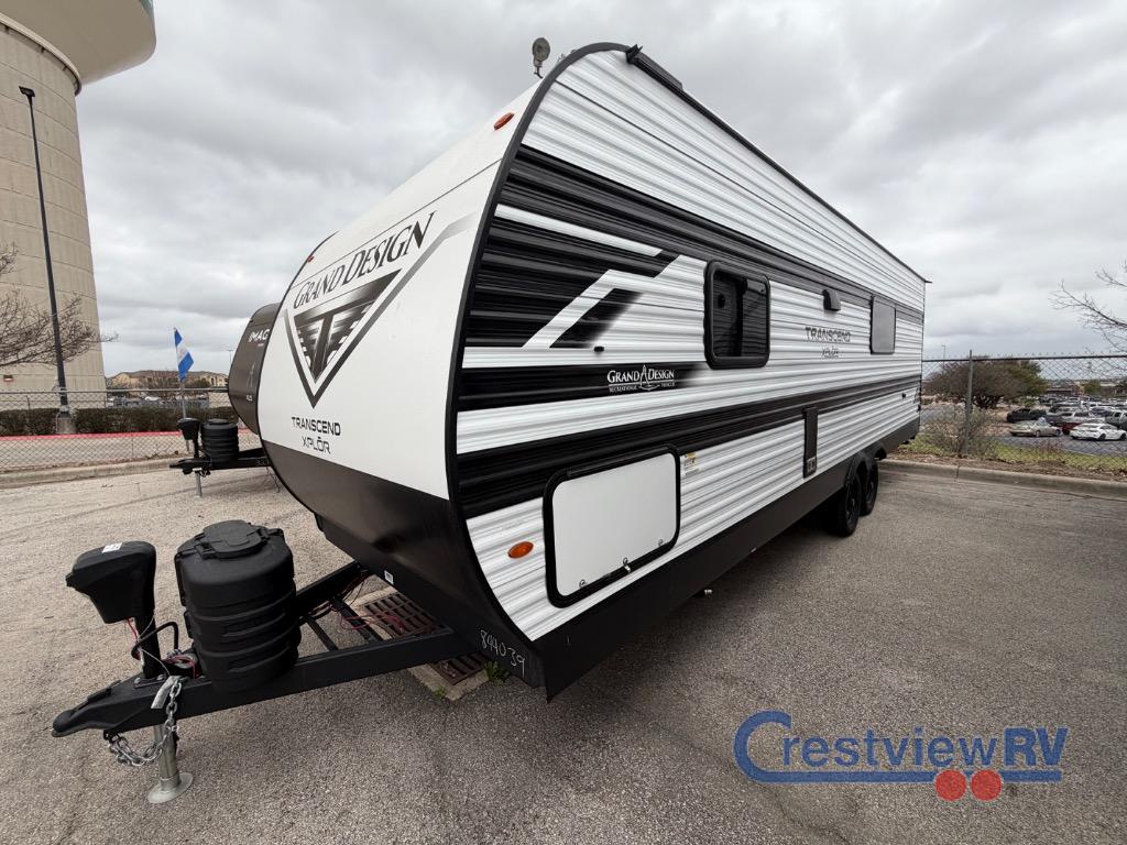Grand Design Transcend Xplor travel trailer 24BHX highlights: 69" Rollover Sofa, Pet Dish, 15' Power Awning with LED Light, Double-Size Bunks. This is the perfect travel trailer if you like to camp with friends and family. Since there are double-size bunks, a queen bed in the front bedroom, plus a booth dinette and sofa, you can sleep eight campers each night! The three burner range and microwave in the kitchen will let you cook meals each day, and the 12V refrigerator will keep your cold items fresh. This model also includes a counter with extra storage, a pull-out trash can storage for convenience, and a full bath to freshen up in each day. And you'll love having your own space in the front bedroom with a privacy curtain. The customer-focused, quality-built Transcend Xplor will have you feeling right at home with this new model. The interior of the trailer will have you feeling right at home with upgraded residential furniture, residential countertops, residential cabinet doors, and the list goes on! The power tongue jack when it comes time to set up, as well as the all-in-one utility center and the detachable power cord with an LED light. These models include many outlets throughout, USB ports to charge your gadgets, and a JBL exterior speaker to listen to your favorite tunes.
