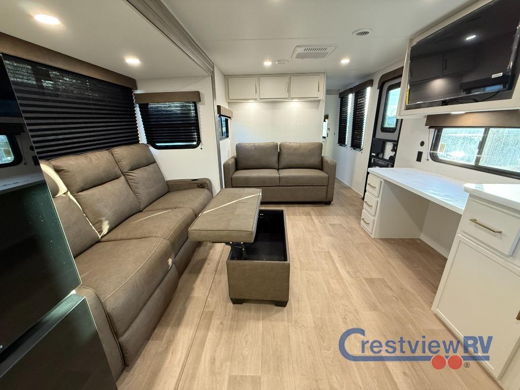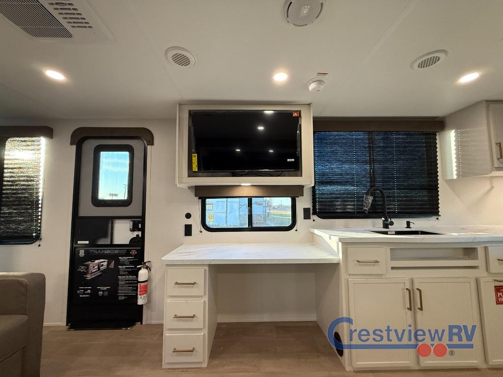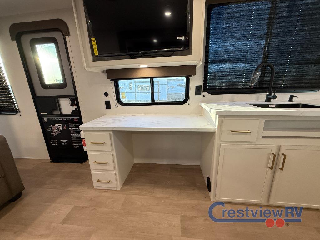 Grand Design Transcend travel trailer 315RKT highlights: Rear Kitchen, Exterior Griddle, Slide Out Pet Dish, Kitchen Pantry, Front Private Bedroom, Storage Ottoman. If you're looking for a cozy travel trailer for two, this is the one! You can sleep soundly each night on the king bed slide out, and you'll find plenty of storage in the front wardrobe. There is even washer and dryer prep if you choose to add those appliances. After you've freshened up in the full bath with a walk-in shower, you can head to the rear kitchen to make breakfast. There is ample counter space here, along with a three burner range and an air fryer/convection microwave, plus a pull-out trash can for easy clean up. The breakfast nook provides a fun place to dine together, and if you're needing additional sleeping space you can switch it out for the optional sleeper sofa. A theater seating slide also provides tons of comfort, especially since it's in perfect view of the 32" TV! This model also includes an exterior griddle with a 1.7 cu. ft. refrigerator, protected by the 21' power awning so you can cook in the shade! With any Transcend travel trailer by Grand Design, you will enjoy upscale appointments and convenient amenities to make each camping experience one to remember! The Quad Seal technology, residential insulated walls, plus heated and enclosed underbelly with suspended tanks make these units solid and durable. There is a black automotive glass door outside, along with a Safe-T-Rail assist on the main entry door, backup camera prep, and a universal docking station. JBL interior and exterior speakers plus a JBL head unit will let you listen to your favorite tunes as you visit under the power awning with LED strip lights. Inside, you'll enjoy multiple outlets to keep your gadgets charged, thermoformed and seamless countertops, and a 6' 6" interior height so you won't feel closed in. The Solar Prep Package will allow you to enjoy off-grid capabilities with a 200W solar panel, which is wired for up to 600W, a 30 AMP Bluetooth solar controller, a 2000W inverter prep, and more!