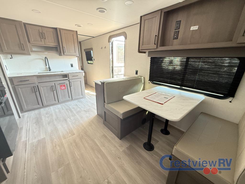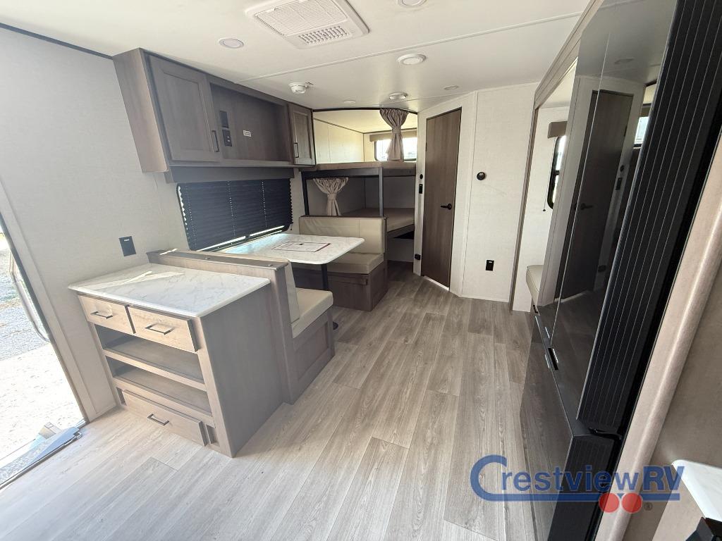 Grand Design Transcend Xplor travel trailer 26BHX highlights double-size bunk beds with curtains, booth dinette, entry counter with shoe storage, queen bed, 60" roll over sofa, and a full bath. This unit sleeps nine with the double-size bunks in the rear corner, the 60" roll over sofa, and the queen bed in the front semi-private bedroom. The booth dinette can also be used to sleep a guest or two little ones at night once converted. Prepare your meals on the three-burner cooktop indoors, or out on the two-burner cooktop at the outside kitchen! You'll also find a handy exterior spray port and an outdoor refrigerator for cold drinks! The customer-focused, quality-built Transcend Xplor travel trailers by Grand Design are your ticket to fun and adventure. You will appreciate the power tongue jack when it comes time to set up, as well as the all-in-one utility center and the detachable power cord with an LED light. These models include many outlets throughout, USB ports to charge your gadgets, and a JBL exterior speaker to listen to your favorite tunes. The interior of the Transcend Xplor will have you feeling right at home with upgraded residential furniture, residential countertops, residential cabinet doors, and the list goes on!