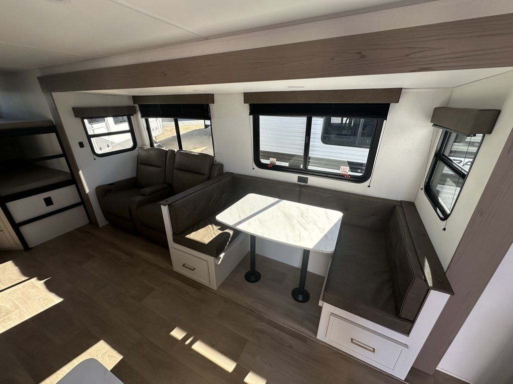 Get ready to take your travels to new heights with our incredible luxury travel trailer! The front bedroom has a queen bed, wardrobe, and overhead cabinets for all your favorite belongings, the perfect place to relax and recharge after a long day of adventure. The living room/kitchen combined area is equipped with a U-shaped dinette, three-burner cooktop, microwave, refrigerator, pantry, and 62” theater seating. Perfect for cooking up your favorite meals, entertaining friends and family, or simply relaxing and enjoying the comforts of home. The full bathroom is spacious and complete with a linen closet for added convenience. And with double-sized bunk beds featuring curtains and under-bunk storage, the kids will have their cozy retreat. But the adventure doesn't stop there! Outside, you'll find an exterior griddle with a 1.7 refrigerator, perfect for cooking up a storm in the great outdoors. And with a massive 19’ awning, you'll have plenty of shade and protection from the elements, plus, with two entry/exit doors and pass-through storage, you'll have easy access to the trailer and all your gear. Thank you for shopping at JR Motors Lake Havasu City's premier RV dealership with a huge selection of RV's in stock and ready for immediate delivery "we got what you want at JR Motors".