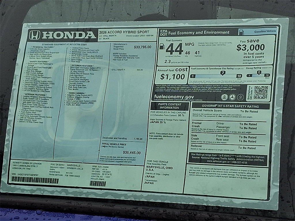 Still Night Pearl 2026 Honda Accord Hybrid Sport FWD CVT 2.0L I4 DOHC 16V 2.0L I4 DOHC 16V, Adaptive Cruise Control: Adaptive Cruise Control (ACC) with Low-Speed Follow, Apple CarPlay/Android Auto, Auto High-beam Headlights, Blind Spot Information (BSI) System warning, Heated front seats, Lane departure: Lane Keeping Assist System (LKAS) active, Remote keyless entry. Recent Arrival! 46/41 City/Highway MPG