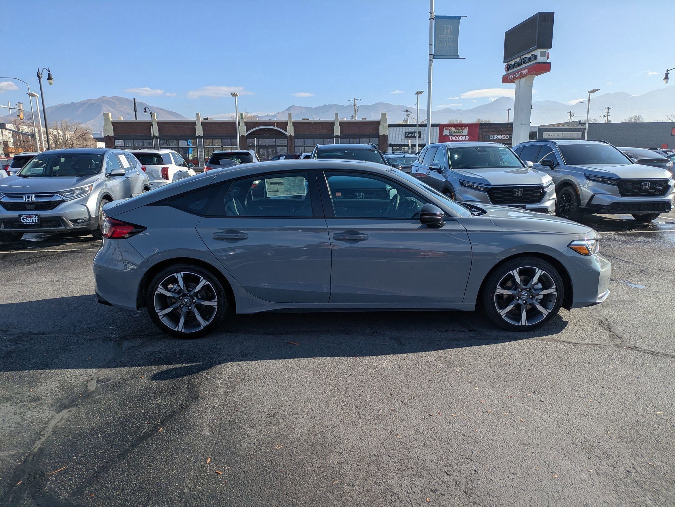 Ken Garff Honda is excited to offer this beautiful 2026 Honda Civic Hybrid Sport Touring in Urban Gray Pearl. FWD Sport Touring eCVT2.0L I4 DOHC 16V, 12 Speakers, 4-Wheel Disc Brakes, ABS brakes, Adaptive Cruise Control: Adaptive Cruise Control (ACC) with Low-Speed Follow, Air Conditioning, Alloy wheels, AM/FM radio, Apple CarPlay/Android Auto, Auto High-beam Headlights, Auto-dimming Rear-View mirror, Automatic temperature control, Blind Spot Information (BSI) System warning, Bose Premium Sound System, Brake assist, Compass, Delay-off High Beam Automatics, Heated door mirrors, Heated Front Bucket Seats, Heated door mirrors, Illuminated entry, Knee airbag, Lane departure: Lane Keeping Assist System (LKAS) active, Leather Shift Knob, Leather steering wheel, Leather-Trimmed Seat Trim, Low tire pressure warning, Navigation system: Google Maps, Occupant sensing airbag, Outside temperature display, Overhead airbag, Overhead console, Panic alarm, Passenger door bin, Passenger vanity mirror, Power door mirrors, Power driver seat, Power moonroof, Power passenger seat, Power steering, Power windows, Radio data system, Rain sensing wipers, Rear anti-roll bar, Rear seat center armrest, Rear side impact airbag, Rear window defroster, Rear window wiper, Remote keyless entry, Security system, Speed control, Speed-sensing steering, Split folding rear seat, Steering wheel mounted audio controls, Tachometer, Telescoping steering wheel, Tilt steering wheel.