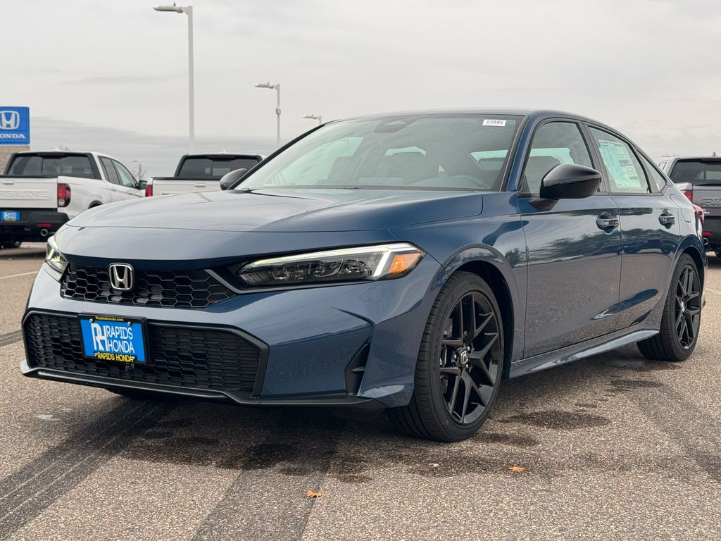 The 2026 Honda Civic Sport builds on the LX with a sportier look and enhanced comfort while maintaining the 2.0L 4-cylinder engine and CVT, achieving an EPA-estimated 31 city / 40 highway mpg. Exterior enhancements include 18-inch alloy wheels, a rear spoiler, and gloss-black accents for a dynamic appearance. Inside, the cabin features sport cloth seats, a leather-wrapped steering wheel, and a center console with added storage. Technology is upgraded with an 8-inch touchscreen infotainment system supporting wireless Apple CarPlay and Android Auto, a 6-speaker audio system, and multiple USB ports. Safety features include the full Honda Sensing suite, Blind-Spot Information with Cross-Traffic Monitor, Adaptive Cruise Control with Low-Speed Follow, Lane Keeping Assist, Road Departure Mitigation, Traffic Sign Recognition, and front & rear parking sensors. The Civic Sport delivers a balance of performance, style, and advanced safety for drivers seeking a sportier, connected sedan experience. Every vehicle at Rapids Honda includes The Rapids Advantage, featuring a Lifetime Powertrain Warranty, Lifetime Car Washes, Windshield Repellency, Shuttle Service, and Auto Butler Environmental Protection, giving you more value long after your purchase.
