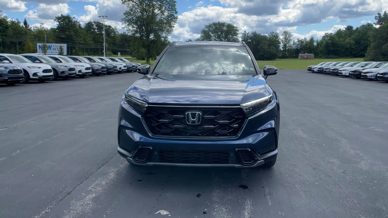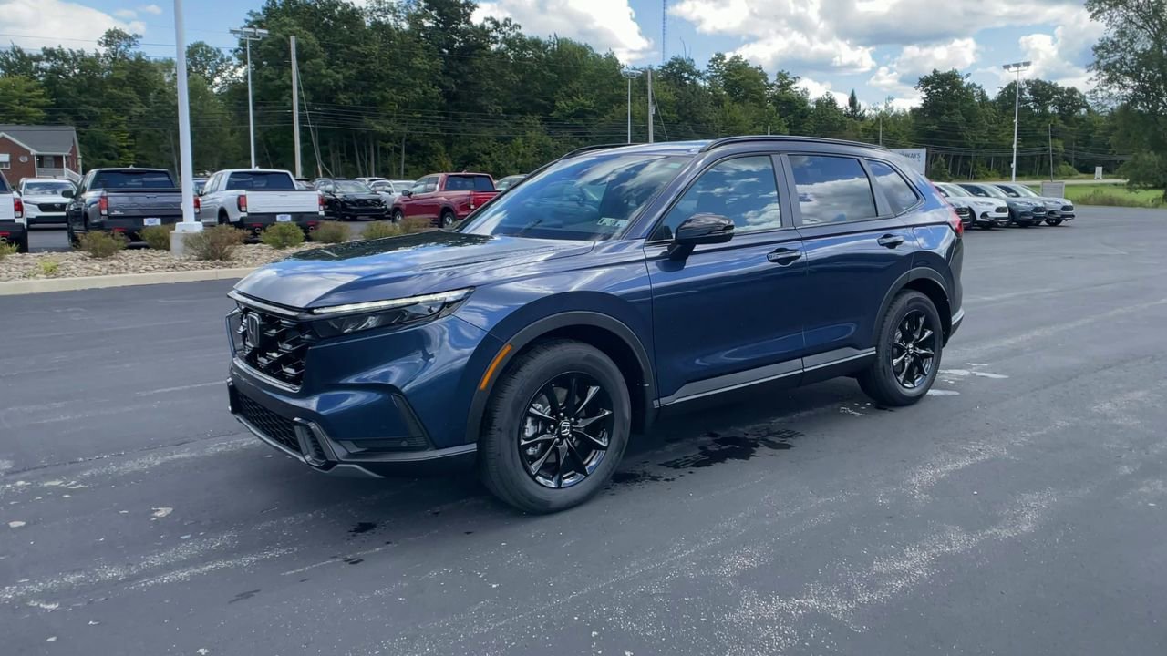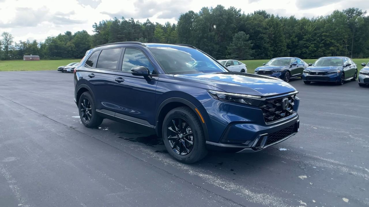 The 2026 Honda CR-V Hybrid Sport-L AWD features a Canyon River Blue Metallic exterior and a black interior. This new model offers a blend of efficiency and comfort, with a gas/electric I-4 engine and advanced safety features. The vehicle is equipped with a moonroof, leather seats, and a 320-Watt AM/FM audio system with wireless Apple CarPlay and Android Auto compatibility. Enjoy a smooth and secure drive with all-wheel drive and a CVT w/OD transmission.