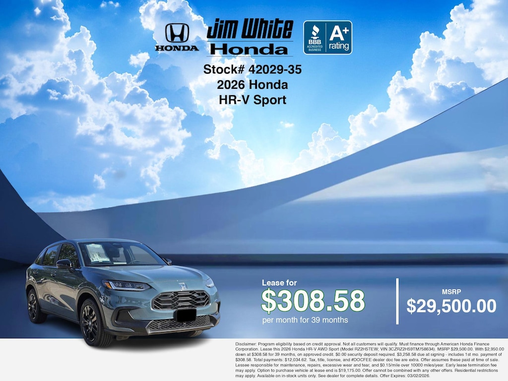 Discover Honda HR-V Sport Exceptional Savings at Jim White Honda! If you are looking to lease a car or explore car lease offers for a new Honda near Maumee, Toledo, Perrysburg, and Waterville, Jim White Honda is thrilled to offer you competitive car lease deals on this 2026 Honda HR-V Sport. This fresh 2026 Honda HR-V Sport available in Maumee, OH boasts an immaculate Nordic Forest Pearl exterior and a refined G-553p/black interior that draws admiration throughout Northwest Ohio and Southeast Michigan. This new vehicle offers outstanding EPA rated fuel economy of 30.0 highway / 25.0 city. Our modern dealership is ideally situated at 1505 S Reynolds Rd, Maumee, OH 43537. We gladly serve the communities of Toledo, Perrysburg, Sylvania, Bowling Green, Findlay, Oregon, Holland, Waterville, Monclova, and throughout Northwest Ohio and Southeast Michigan. We offer the full range of new Honda models with competitive pricing.
