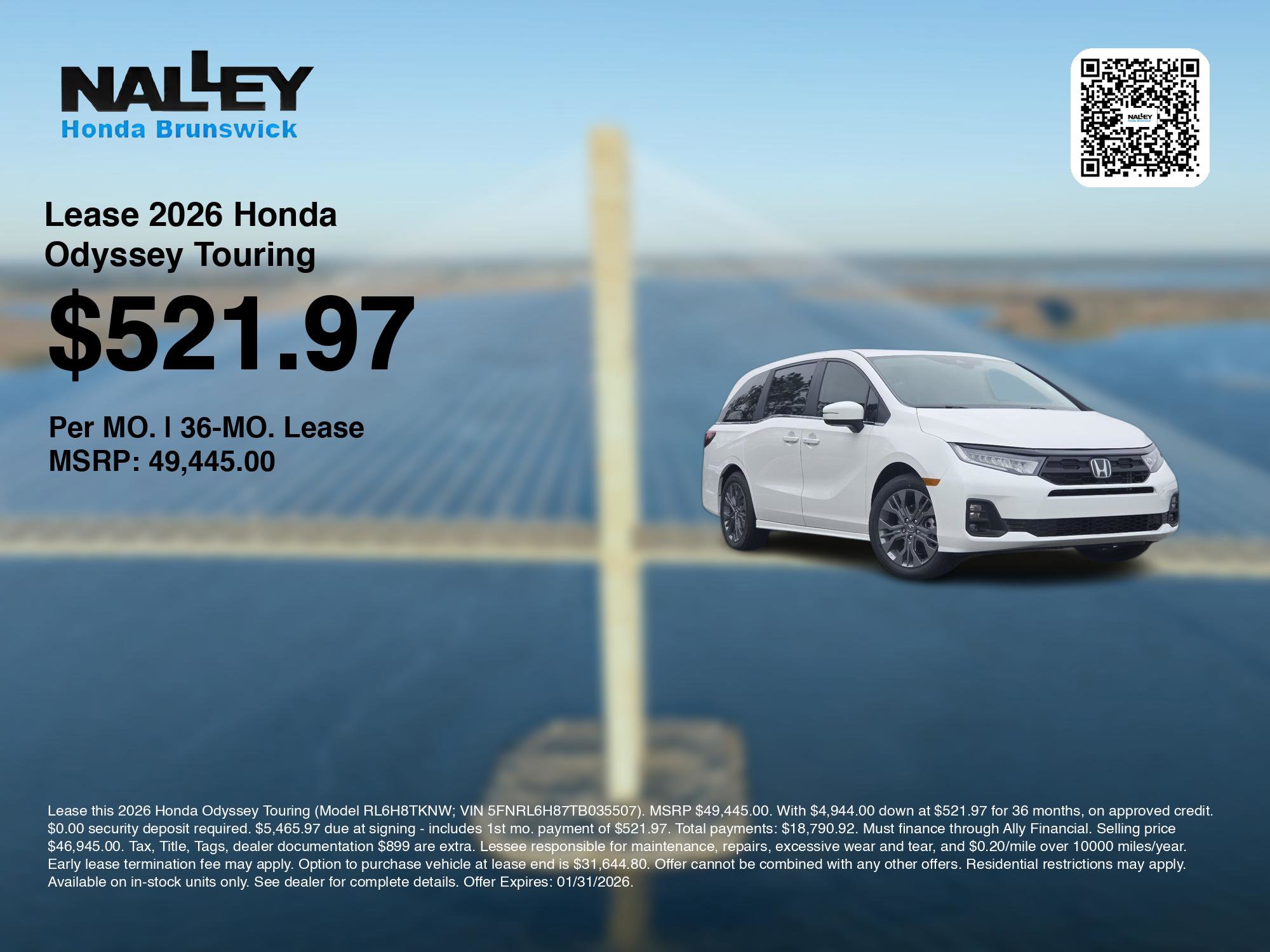 Discover Honda Odyssey Touring Exceptional Savings at Nalley Honda Brunswick! If you are looking to lease a car or explore car lease offers for a new Honda near Brunswick, Darien, St Simons Island, and Country Club Estates, Nalley Honda Brunswick is thrilled to offer you competitive car lease deals on this 2026 Honda Odyssey Touring. Here is how the monthly payment of $521.97 is calculated for well-qualified buyers shopping Nalley Honda Brunswick with Tier 1 credit (use our car lease calculator or monthly car payment calculator for estimates). This and other lease offers leverage the benefits of Honda Financial Services, along with current Honda incentives, Honda Odyssey Touring specials, and tax incentives available on electric vehicles. Additionally, we offer 5 other Odyssey Touring options for the best selection in Brunswick. Call or drive in for competitive Honda lease offers you can drive home today, like this stunning 2026 Honda Odyssey with lease options near Brunswick! This Odyssey is also available for sale near Darien, St Simons Island, and Country Club Estates. These Honda lease specials end 1/31/2026. If you are ready to finance a new Honda near Brunswick, Darien, St Simons Island, and Country Club Estates, Nalley Honda Brunswick is thrilled to offer you competitive finance deals on this 2026 Honda Odyssey Touring. Our car payment calculator and estimator tools can help you understand these finance offers that leverage the benefits of Honda Financial Services, along with Honda vehicle incentives right now and current Honda Odyssey Touring specials. Additionally, we offer 5 other Odyssey Touring options for the best selection in Brunswick. Call or drive in for Honda finance deals you can drive home today! Available at our Honda dealership, this new 2026 Honda Odyssey for sale features a breathtaking Platinum White Pearl exterior with an attractive Brown interior. Enjoy every minute of your journey in the cabin of this new Honda Odyssey, including features such as: Automatic Climate Control, Heated Front Seats, Moon Roof, Third Row Seats, Leather Seats, Rear Heat / AC, Leather Wrapped Steering Wheel, Power Moonroof, Memory Seats, Power Drivers Seat, Compass, Rear Reading Lights, Telescoping Wheel, Steering Wheel Audio Controls, Illuminated entry, Memory Mirrors, Air Conditioning, Bucket Front Seats, Rear Seat Center Armrest, Multi-zone Climate Control, Auto Dimming R/V Mirror, Outside Temperature Gauge, Rear Window Defroster, Trip Odometer, Split Folding Rear Seat, Reading Lights, Tilt Steering Wheel, Overhead Console, Vanity Mirrors, Cup Holder(s). On this 2026 Honda Odyssey, include: Navigation System, Android Auto by Google, Apple CarPlay Capable, Bluetooth Connection, Garage Door Opener, SiriusXM Satellite Radio, Homelink System, Keyless Entry & Back-Up Camera, Lane Departure Warning, Blind Spot Monitoring, Electronic Stability Control, Lane Keeping Assist System, Aftermarket Anti Theft System, Emergency SOS system, Integrated Turn Signal Mirrors, Brake Assist, Adaptive Cruise Control, Security System, ABS Brakes, Knee AirBag, Tire Pressure Monitoring System, Auto Highbeams, Speed Sensitive Power Steering, Overhead airbag, Dual Air Bags, Delay-off headlights, Low tire pressure warning, Passenger Air Bag Sensor, Front anti-whiplash head restraints, Driver Front Side Impact Air Bag. This fwd 2026 Honda Odyssey is factory-equipped with an outstanding 3.5l v6 sohc i-vtec 24v engine, and a 10-speed automatic transmission.