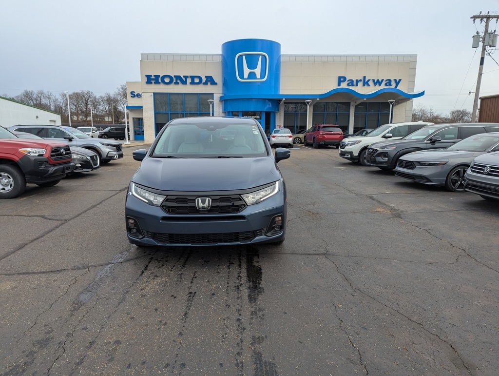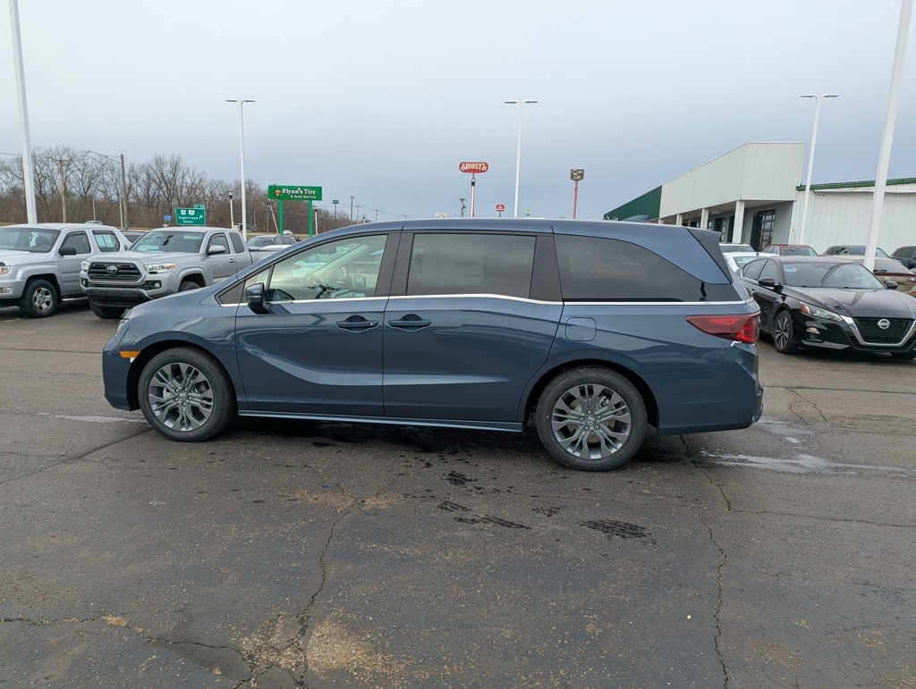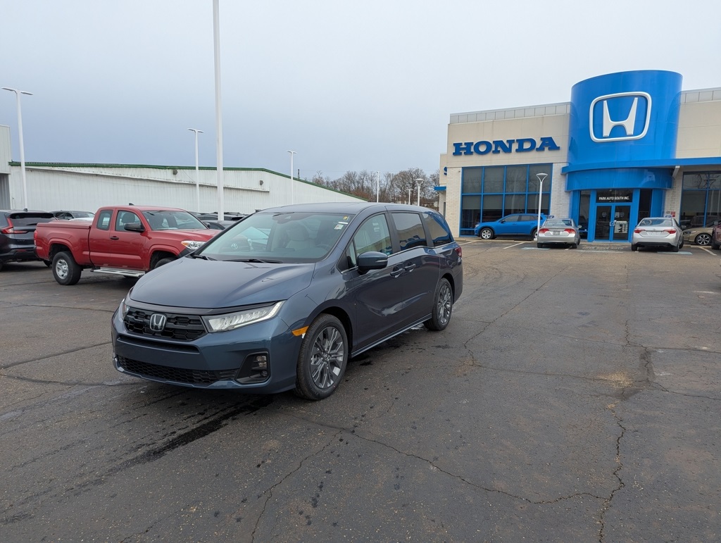 2026 Honda Odyssey Touring Smoke Blue Pearl FWD 3.5L V6 SOHC i-VTEC 24V 10-Speed Automatic. 3rd row seats: split-bench, 4-Wheel Disc Brakes, 7 Speakers, ABS brakes, Adaptive Cruise Control with Low-Speed Follow, Air Conditioning, Alloy wheels, AM/FM radio: SiriusXM, Anti-whiplash front head restraints, Apple CarPlay/Android Auto, Auto High-beam Headlights, Auto-dimming Rear-View mirror, Automatic temperature control, Blind Spot Information System warning, Brake assist, Bumpers: body-color, Compass, Delay-off headlights, Driver door bin, Driver vanity mirror, Driver's Seat Mounted Armrest, Dual front impact airbags, Dual front side impact airbags, Electronic Stability Control, Emergency communication system: HondaLink, Exterior Parking Camera Rear, Four wheel independent suspension, Front anti-roll bar, Front Bucket Seats, Front dual zone A/C, Front fog lights, Front reading lights, Fully automatic headlights, Garage door transmitter: HomeLink, Heated door mirrors, Heated Front Bucket Seats, Heated front seats, Illuminated entry, Knee airbag, Lane departure: Lane Keeping Assist System active, Leather steering wheel, Leather-Trimmed Seats with Piping, Low tire pressure warning, Memory seat, Navigation system: Honda Satellite-Linked Navigation System, Occupant sensing airbag, Outside temperature display, Overhead airbag, Overhead console, Panic alarm, Passenger door bin, Passenger seat mounted armrest, Passenger vanity mirror, Power door mirrors, Power driver seat, Power Liftgate, Power moonroof, Power passenger seat, Power steering, Power windows, Radio data system, Radio: 160-Watt AM/FM/HD/SiriusXM Audio System, Rear air conditioning, Rear anti-roll bar, Rear audio controls, Rear reading lights, Rear seat center armrest, Rear window defroster, Rear window wiper, Reclining 3rd row seat, Remote keyless entry, Security system, Speed control, Speed-sensing steering, Speed-Sensitive Wipers, Split folding rear seat, Spoiler, Steering wheel mounted audio controls, Tachometer, Telescoping steering wheel, Tilt steering wheel, Traction control, Trip computer, Turn signal indicator mirrors, Variably intermittent wipers.