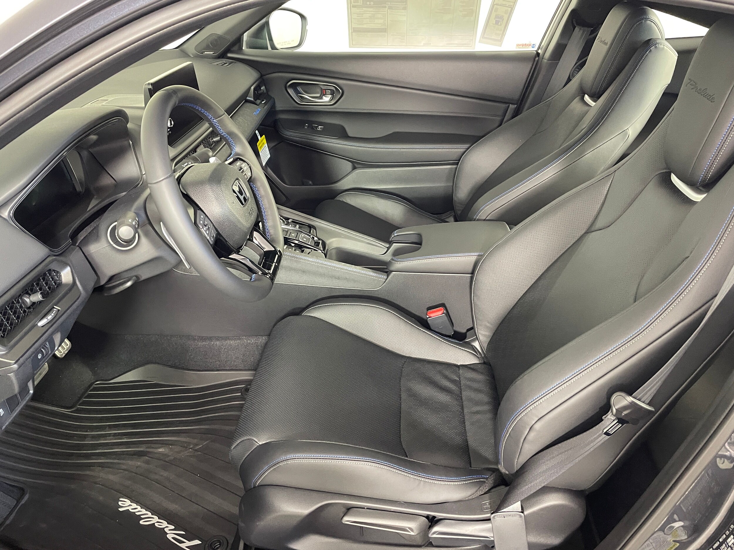 - Leather-trimmed seats with blue accent stitching