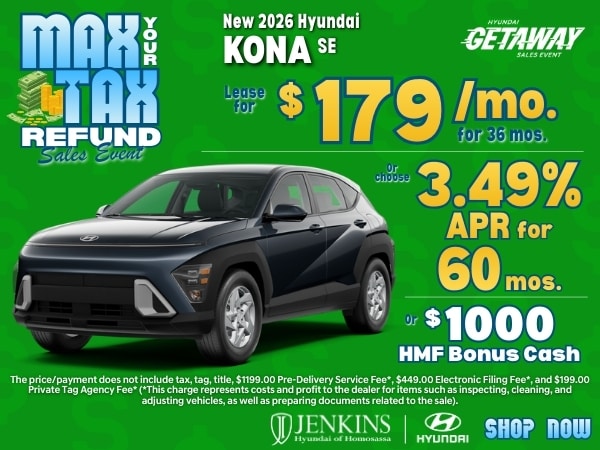 Denim Blue Pearl 2026 Hyundai Kona SEL Sport FWD CVT 2.0L I4 DOHC 16V. Recent Arrival! 28/35 City/Highway MPG. Price includes: $1000 - Hyundai HMF Dealer Choice: $1000 discount and 5.39% APR for 24 months. $44.05 per $1000 financed. Available to well qualified buyers who finance through Hyundai Motor Finance. H704. Exp. 03/31/2026. Jenkins Hyundai of Homosassa is dedicated to your satisfaction before, during, and after your purchase. We'll go the extra mile to take care of you.