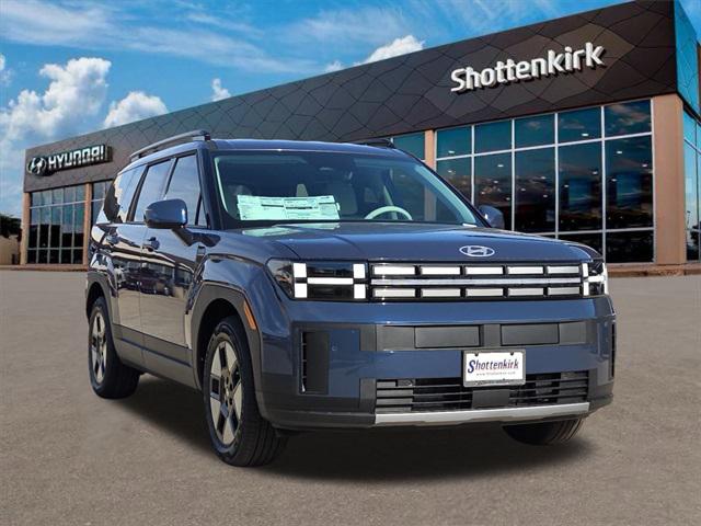 Atlantis Blue 2026 Hyundai Santa Fe Hybrid SEL FWD I4. This vehicle comes well equipped with Option Group 01, 18" x 7.5J Alloy Wheels, 3rd row seats: bench, 4-Wheel Disc Brakes, 6 Speakers, ABS brakes, Air Conditioning, All Season Fitted Liners, Alloy wheels, AM/FM radio: SiriusXM, Apple CarPlay & Android Auto, Auto High-beam Headlights, Automatic temperature control, Brake assist, Bumpers: body-color, Cargo Net, Carpeted Floor Mats, Delay-off headlights, Driver door bin, Driver vanity mir... (more)