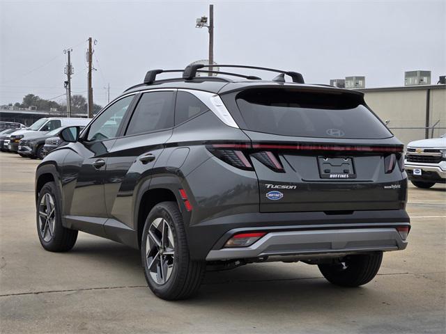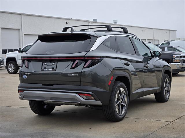 Gray 2026 Hyundai Tucson Hybrid SEL Convenience 4D Sport Utility SEL Convenience AWD 6-Speed Automatic 1.6L I4 DGI Hybrid Turbocharged DOHC 16V LEV3-SULEV30 Option Group 01, 18" x 7.5J Alloy Wheels, 4-Wheel Disc Brakes, 6 Speakers, ABS brakes, Air Conditioning, Alloy wheels, AM/FM radio: SiriusXM, Apple CarPlay & Android Auto, Auto High-beam Headlights, Auto-dimming Rear-View mirror, Automatic temperature control, Brake assist, Bumpers: body-color, Cargo Cover, Cargo Net, Cargo Tray, Carpeted Floor Mats, Delay-off headlights, Driver door bin, Driver vanity mirror, Dual front impact airbags, Dual front side impact airbags, Electronic Stability Control, Emergency communication system: None, First Aid Kit, Four wheel independent suspension, Front anti-roll bar, Front Bucket Seats, Front Center Armrest, Front dual zone A/C, Front reading lights, Fully automatic headlights, H-Tex Trimmed Seat Trim, Heated door mirrors, Heated Front Bucket Seats, Heated front seats, Illuminated entry, Leather steering wheel, Low tire pressure warning, Occupant sensing airbag, Outside temperature display, Overhead airbag, Overhead console, Panic alarm, Passenger door bin, Passenger vanity mirror, Power door mirrors, Power driver seat, Power Liftgate, Power steering, Power windows, Radio data system, Radio: AM/FM/HD Audio System, Rear anti-roll bar, Rear reading lights, Rear seat center armrest, Rear side impact airbag, Rear window defroster, Rear window wiper, Remote keyless entry, Roadside Assistance Kit, Roof Rack Cross Rails, Security system, Speed control, Split folding rear seat, Spoiler, Steering wheel mounted audio controls, Tachometer, Telescoping steering wheel, Tilt steering wheel, Traction control, Trip computer, Turn signal indicator mirrors, and Variably intermittent wipers.
