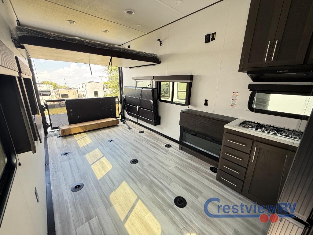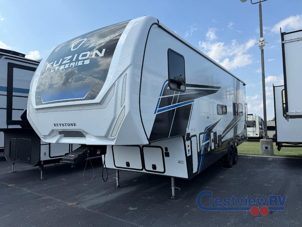 Keystone Fuzion Impact Edition LT Series toy hauler 321LT highlights: Front Private Bedroom, Flip-Up Countertop, 10 Cu. Ft. 12V Refrigerator, 15' 8" Garage Area. You'll love every minute camping in this spacious toy hauler! There are 5k lb. frame welded tie-downs to help keep your toys secure, and the 15' 8" garage area can easily transform to living and sleeping space. There is a sofa with a top queen bed here for guests, and a flip-up countertop with a window across the room that will be perfect to set your things on and enjoy the view. Head to the kitchen where you'll find a cooktop, a 12V refrigerator, and a second flip-up countertop with a fireplace below to make your space more cozy! The full bath towards the front will let you freshen up after a trail ride, and you're sure to appreciate having your own bedroom with a residential queen bed, dual nightstands, and a wardrobe for clothes! Embrace the great outdoors with a Fuzion Impact Edition toy hauler by Keystone! There are laminated fiberglass sidewalls and an 8' 4" wide-body construction for your toys and gear! The one-piece polypropylene heated underbelly includes enclosed tanks and valves which will help extend your camping season, and the leaf spring suspension system will provide smooth towing. Head inside to enjoy night shades, hardwood cabinetry, and fiberglass backed linoleum floor with no carpet for easy cleaning. Each model also includes a Girard on-demand water heater, two 30 lb. LP tanks, recessed LED puck lighting throughout, and the list of comforts goes on!