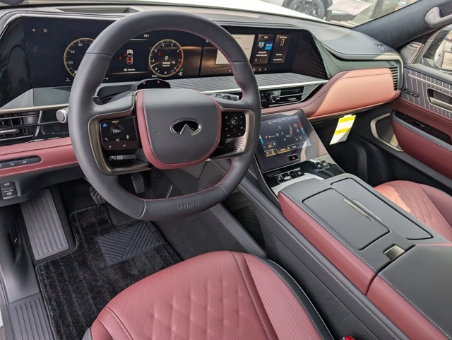 This handsome-looking 2026 INFINITI QX80 AutoGRAPH in Radiant White/Black Obsidian features Premium Cargo Package (Cargo Blocks/Stabilizers, Cargo Shelf/Barrier, Carpeted Cargo Area Protector, Console Net, and Soft-Sided Cargo Cooler), 3rd row seats: bench, 4-Wheel Disc Brakes, ABS brakes, Adaptive suspension, Air Conditioning, Alloy wheels, AM/FM radio: SiriusXM with 360L, Anti-whiplash front head restraints, Apple CarPlay/Android Auto, Audio memory, Auto High-beam Headlights, Auto tilt-away steering wheel, Auto-dimming door mirrors, Auto-dimming Rear-View mirror, Auto-leveling suspension, Automatic temperature control, Brake assist, Bumpers: body-color, Compass, Delay-off headlights, Driver door bin, Driver vanity mirror, Dual front impact airbags, Dual front side impact airbags, Electronic Stability Control, Emergency communication system: INFINITI InTouch, Four wheel independent suspension, Front anti-roll bar, Front Bucket Seats, Front Center Armrest, Front dual zone A/C, Front reading lights, Fully automatic headlights, Garage door transmitter: myQ Connected Garage, Genuine wood dashboard insert, Genuine wood door panel insert, Heads-Up Display, Heated and Climate Controlled Front Bucket Seats with Massage, Heated door mirrors, Heated front seats, Heated rear seats, Heated steering wheel, HVAC memory, Illuminated entry, Knee airbag, Leather steering wheel, Low tire pressure warning, Memory seat, Navigation system: Google Built-in, Occupant sensing airbag, Outside temperature display, Overhead airbag, Overhead console, Panic alarm, Passenger door bin, Passenger vanity mirror, Power door mirrors, Power driver seat, Power Liftgate, Power moonroof, Power passenger seat, Power steering, Power windows, Radio data system, Radio: Klipsch Premiere Audio System, Rain sensing wipers, Rear air conditioning, Rear anti-roll bar, Rear reading lights, Rear seat center armrest, Rear window defroster, Rear window wiper, Reclining 3rd row seat, Remote keyless entry, Security system, Semi-Aniline Premium Leather Seating Surfaces, Speed control, Speed-sensing steering, Splash Guards, Split folding rear seat, Spoiler, Steering wheel memory, Steering wheel mounted audio controls, Tachometer, Telescoping steering wheel, Tilt steering wheel, Traction control, Trip computer, Turn signal indicator mirrors, Two-Tone Super Premium Paint. Shop 100% Online and We Will Come To You!