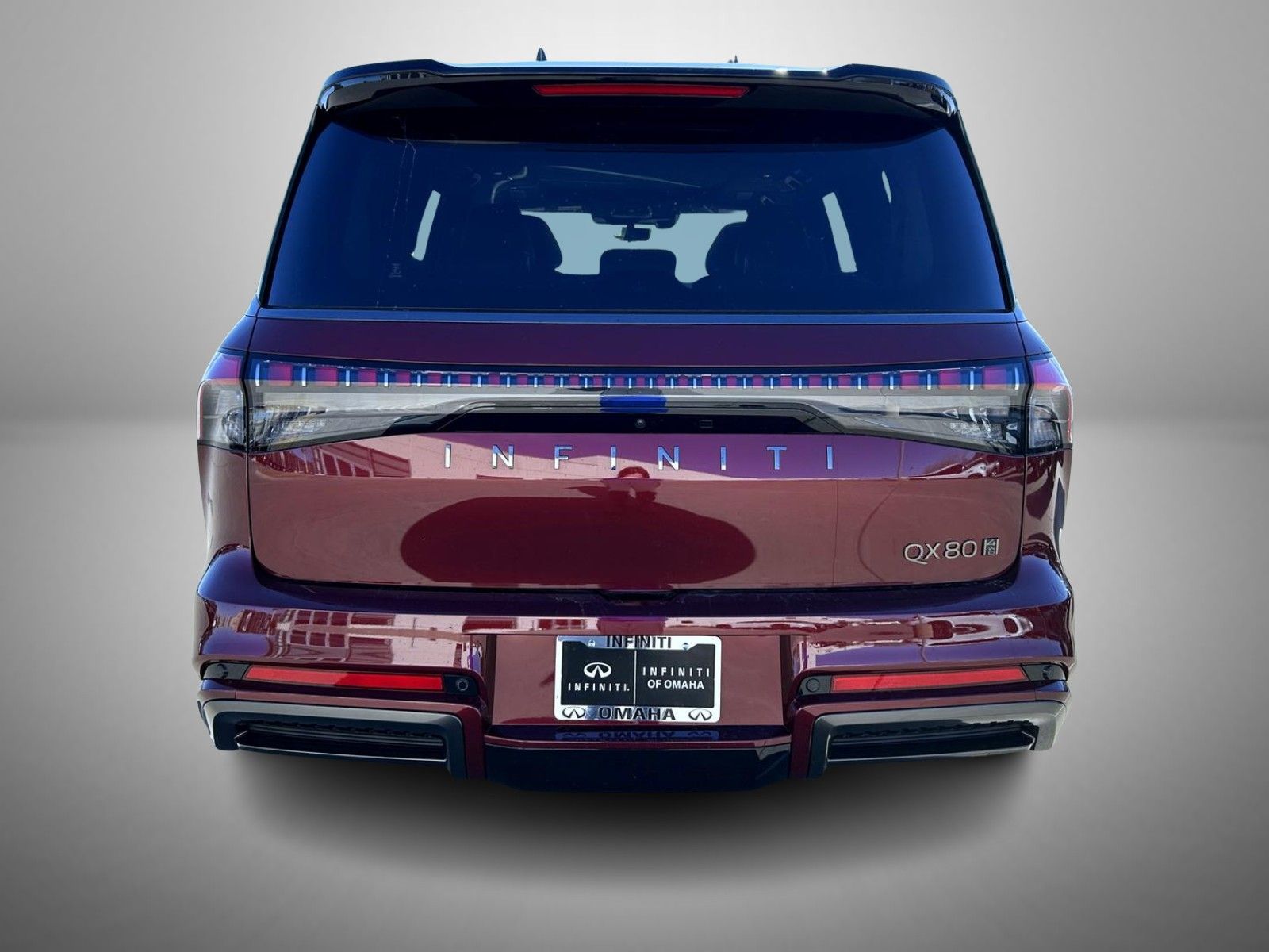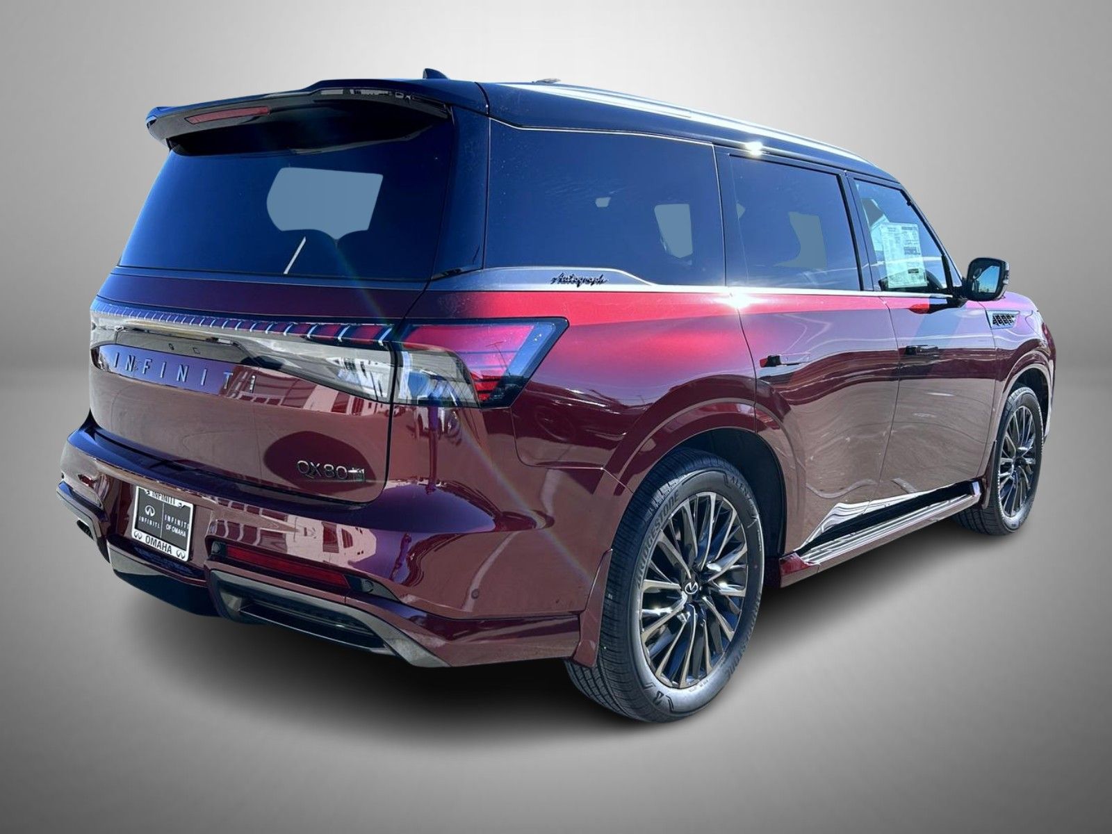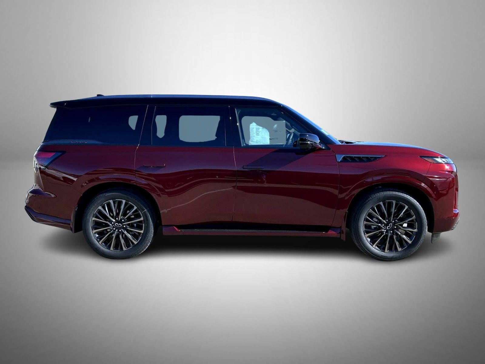 Coulis Red/Black Obsidian 2026 INFINITI QX80 4WD 9-Speed Automatic Twin Turbo Premium Unleaded V-6 3.5 L/213 3rd row seats: bench, 4-Wheel Disc Brakes, ABS brakes, Adaptive suspension, Air Conditioning, Alloy wheels, AM/FM radio: SiriusXM with 360L, Anti-whiplash front head restraints, Apple CarPlay/Android Auto, Audio memory, Auto High-beam Headlights, Auto tilt-away steering wheel, Auto-dimming door mirrors, Auto-dimming Rear-View mirror, Auto-leveling suspension, Automatic temperature control, Brake assist, Bumpers: body-color, Cargo Blocks/Stabilizers, Cargo Shelf/Barrier, Carpeted Cargo Area Protector, Compass, Console Net, Delay-off headlights, Driver door bin, Driver vanity mirror, Dual front impact airbags, Dual front side impact airbags, Electronic Stability Control, Emergency communication system: INFINITI InTouch, Four wheel independent suspension, Front anti-roll bar, Front Bucket Seats, Front Center Armrest, Front dual zone A/C, Front reading lights, Fully automatic headlights, Garage door transmitter: myQ Connected Garage, Genuine wood dashboard insert, Genuine wood door panel insert, Heads-Up Display, Heated and Climate Controlled Front Bucket Seats with Massage, Heated door mirrors, Heated front seats, Heated rear seats, Heated steering wheel, HVAC memory, Illuminated entry, Knee airbag, Leather steering wheel, Low tire pressure warning, Memory seat, Navigation system: Google Built-in, Occupant sensing airbag, Outside temperature display, Overhead airbag, Overhead console, Panic alarm, Passenger door bin, Passenger vanity mirror, Power door mirrors, Power driver seat, Power Liftgate, Power moonroof, Power passenger seat, Power steering, Power windows, Premium Cargo Package, Radio data system, Radio: Klipsch Premiere Audio System, Rain sensing wipers, Rear air conditioning, Rear anti-roll bar, Rear reading lights, Rear seat center armrest, Rear window defroster, Rear window wiper, Reclining 3rd row seat, Remote keyless entry, Security system, Semi-Aniline Premium Leather Seating Surfaces, Soft-Sided Cargo Cooler, Speed control, Speed-sensing steering, Splash Guards, Split folding rear seat, Spoiler, Steering wheel memory, Steering wheel mounted audio controls, Tachometer.
