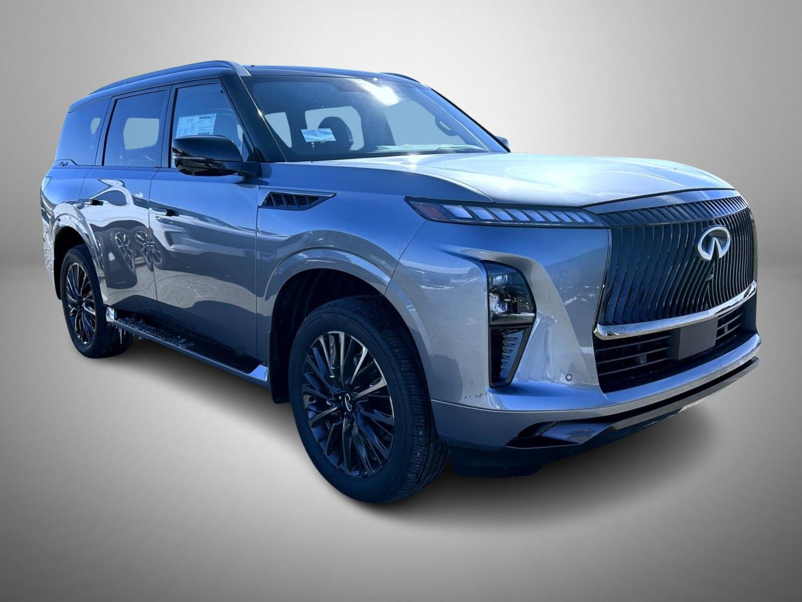 Dynamic Metal/Black Obsidian 2026 INFINITI QX80 4WD 9-Speed Automatic Twin Turbo Premium Unleaded V-6 3.5 L/213 3rd row seats: bench, 4-Wheel Disc Brakes, ABS brakes, Adaptive suspension, Air Conditioning, Alloy wheels, AM/FM radio: SiriusXM with 360L, Anti-whiplash front head restraints, Apple CarPlay/Android Auto, Audio memory, Auto High-beam Headlights, Auto tilt-away steering wheel, Auto-dimming door mirrors, Auto-dimming Rear-View mirror, Auto-leveling suspension, Automatic temperature control, Black Interior Lighting Package, Brake assist, Bumpers: body-color, Cargo Blocks/Stabilizers, Cargo Shelf/Barrier, Carpeted Cargo Area Protector, Compass, Console Net, Delay-off headlights, Driver door bin, Driver vanity mirror, Dual front impact airbags, Dual front side impact airbags, Electronic Stability Control, Emergency communication system: INFINITI InTouch, Four wheel independent suspension, Front anti-roll bar, Front Bucket Seats, Front Center Armrest, Front dual zone A/C, Front reading lights, Fully automatic headlights, Garage door transmitter: myQ Connected Garage, Genuine wood dashboard insert, Genuine wood door panel insert, Heads-Up Display, Heated and Climate Controlled Front Bucket Seats with Massage, Heated door mirrors, Heated front seats, Heated rear seats, Heated steering wheel, HVAC memory, Illuminated entry, INFINITI Radiant Black Cargo Scuff Plates, Knee airbag, Leather steering wheel, Low tire pressure warning, Memory seat, Navigation system: Google Built-in, Occupant sensing airbag, Outside temperature display, Overhead airbag, Overhead console, Panic alarm, Panoramic Illuminated Headliner, Passenger door bin, Passenger vanity mirror, Power door mirrors, Power driver seat, Power Liftgate, Power moonroof, Power passenger seat, Power steering, Power windows, Premium Cargo Package, Radio data system, Radio: Klipsch Premiere Audio System, Rain sensing wipers, Rear air conditioning, Rear anti-roll bar, Rear reading lights, Rear seat center armrest, Rear window defroster, Rear window wiper, Reclining 3rd row seat.