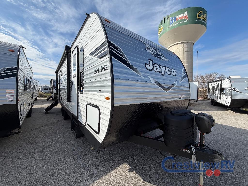 Jayco Jay Flight SLX travel trailer 262RLS highlights: Private Bedroom, Jack-Knife Sofa, Radius Shower, Rear Living Area. You can comfortably sleep up to six people in this trailer thanks to the RV queen bed in the front bedroom, plus the booth dinette and jack-knife sofa in the main living area! The chef of your crew will have a three burner cooktop and microwave oven to prepare meals, and everyone can store their favorite drinks in the 8 cu. ft. 12V refrigerator. The walk-through bath is spacious and includes a radius shower, toilet, a sink, and linen closet and is the full width of the unit. The outside storage will let you bring along camp chairs and games, fishing poles and more, plus the 18' 3" power awning with LED lights will create a nice place to gather in the evenings! The Jayco Jay Flight SLX travel trailer is quite easy to own because it is lightweight for an easier towing experience. Built on a fully integrated A-frame with galvanized-steel, impact-resistant wheel wells, the Jay Flight SLX has quality at its very foundation. That quality continues on to the electric self-adjusting brakes, easy-lube hubs, Magnum Truss roof system, and LP quick connect. Some of what the mandatory Customer Value Package includes is backup camera prep, Keyed-Alike entry and baggage doors, and an on-demand tankless water heater.