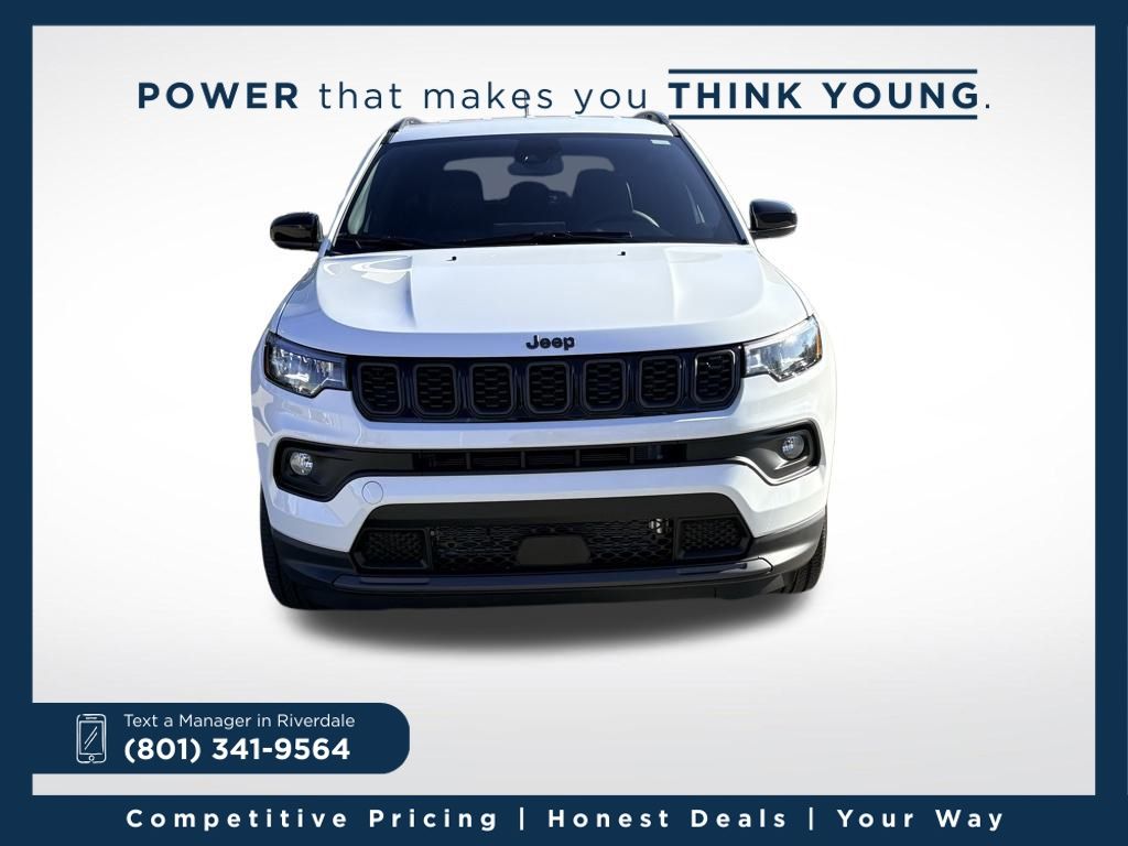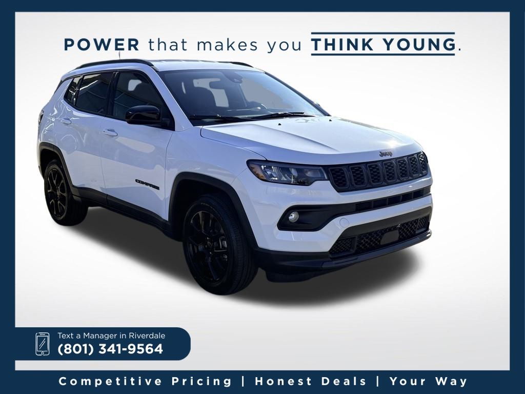 2026 Jeep Compass Latitude Bright White Clearcoat 2.0L I4 DOHC 8-Speed Automatic 4WD. 23/31 City/Highway MPG. Actual vehicle price and payments may vary for various reasons, including but not limited to, applicable manufacturer rebates, special limited time offers, dealer incentives, taxes, fees, and buyer's credit qualifications. Listed price for the vehicle does not include fees and costs of closing, including but not limited to, government fees, taxes, document fees, title fees, licensing fees, any dealer documentation fees, any emission, inspection or other testing fees. Contact dealer for most current information. Dealer Documentation fees vary by state.