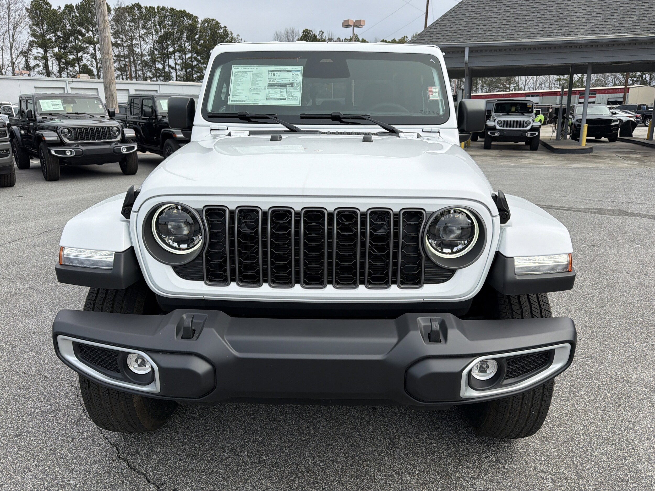 White 2026 Jeep Gladiator Sport 4WD 8-Speed Automatic 3.6L V6 24V VVT 110 Mph Vehicle Max Speed Calibration, 12.3" Touchscreen Display, 3.73 Rear Axle Ratio, 4-Wheel Disc Brakes, 4G LTE Wi-Fi Hot Spot, 8 Speakers, ABS brakes, Air Conditioning, Alexa Built-in, AM/FM radio: SiriusXM with 360L, Apple CarPlay, Apple CarPlay/Android Auto, Brake assist, Compass, Connectivity - US/Canada, Delay-off headlights, Driver door bin, Driver vanity mirror, Dual front impact airbags, Dual front side impact airbags, Electronic Stability Control, For Details, Visit DriveUconnect.com, Front anti-roll bar, Front Bucket Seats, Front Center Armrest w/Storage, Front fog lights, Front reading lights, Google Android Auto, Illuminated entry, Integrated Center Stack Radio, Integrated roll-over protection, Low tire pressure warning, Normal Duty Suspension, Occupant sensing airbag, Outside temperature display, Overhead airbag, Panic alarm, ParkView Rear Back-Up Camera, Passenger door bin, Passenger vanity mirror, Power steering, Power windows, Radio data system, Radio: Uconnect 5 with 12.3" Display, Rear anti-roll bar, Rear reading lights, Remote keyless entry, SiriusXM Radio Service, SiriusXM with 360L, Speed control, Split folding rear seat, Steering wheel mounted audio controls, Tachometer, Telescoping steering wheel, Tilt steering wheel, Traction control, Trip computer.