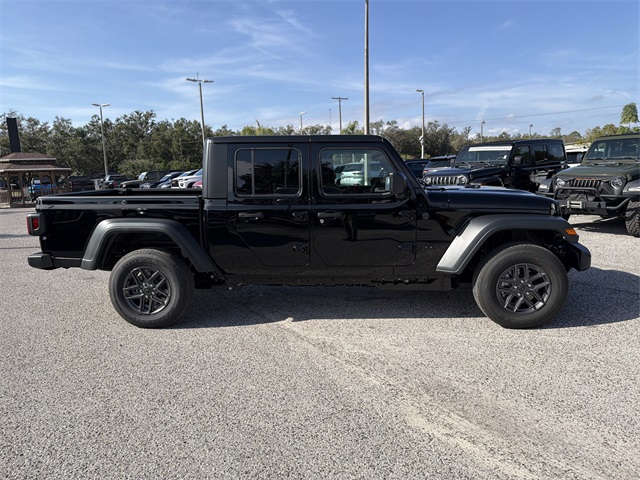 Lack Clearcoat 2026 Jeep Gladiator Sport S 3.6L V6 24V VVT 4WD 8-Speed Automatic Quick Order Package 24S Sport S (Advanced Brake Assist, Automatic Headlamps, Deep Tint Sunscreen Windows, Full Speed Forward Collision Warning Plus, Normal Duty Plus Suspension, Power Heated Mirrors, Premium Wrapped Steering Wheel, Security Alarm, Sun Visors with Illuminated Vanity Mirrors, and Wheels: 17" x 7.5" Gray), 110 Mph Vehicle Max Speed Calibration, 12.3" Touchscreen Display, 3.73 Rear Axle Ratio, 4-Wheel Disc Brakes, 4G LTE Wi-Fi Hot Spot, 8 Speakers, ABS brakes, Air Conditioning, Alexa Built-in, AM/FM radio: SiriusXM with 360L, Apple CarPlay, Apple CarPlay/Android Auto, Black 3-Piece Hard Top, Brake assist, Cloth Low-Back Bucket Seats, Compass, Connectivity - US/Canada, Delay-off headlights, Driver door bin, Driver vanity mirror, Dual front impact airbags, Dual front side impact airbags, Electronic Stability Control, Freedom Panel Storage Bag, Front anti-roll bar, Front Bucket Seats, Front Center Armrest w/Storage, Front fog lights, Front reading lights, Google Android Auto, Illuminated entry, Integrated roll-over protection, Low tire pressure warning, Normal Duty Suspension, Occupant sensing airbag, Outside temperature display, Overhead airbag, Panic alarm, ParkView Rear Back-Up Camera, Passenger door bin, Passenger vanity mirror, Power steering, Power windows, Radio data system, Radio: Uconnect 5 with 12.3" Display, Rear anti-roll bar, Rear reading lights, Rear Sliding Window, Rear Window Defroster. The vehicle features a National title and is in stock at the Dade City dealership.