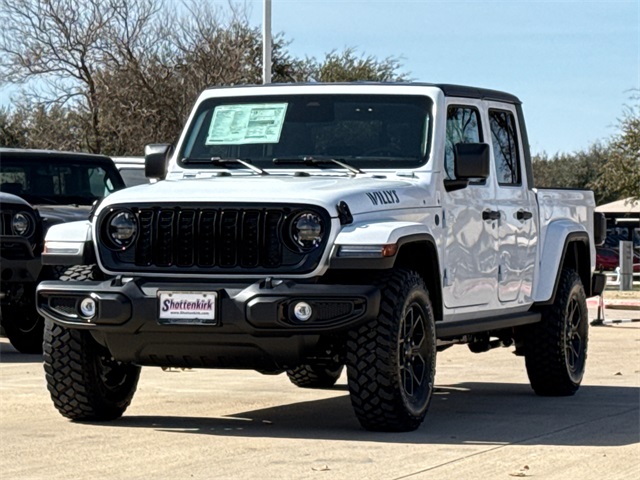 2026 Jeep Gladiator Willys 4D Crew Cab Bright White Clearcoat 4WD 8-Speed Automatic 3.6L V6 24V VVT This vehicle comes well equipped with Convenience Group (Air Conditioning with Auto Temp Control, Cluster 7.0" TFT Color Display, Corning Gorilla Glass, Daytime Running Lamp System, Emergency/Assistance Call, Front Door Locks 2-Door Passive Entry, Heated Front Seats, Heated Steering Wheel, Remote Start System, and Universal Garage Door Opener), Quick Order Package 24W Willys (2-Piece Body Color Fender Flares, 4-Wheel Drive Decal, Advanced Brake Assist, Automatic Headlamps, Auxiliary Switches, Black Grille with Gloss Black Rings, Class IV Receiver Hitch, Daytime Running Lamps LED Accents, Deep Tint Sunscreen Windows, E-Locker Rear Axle, Front Heavy Duty Red Accent Shock Absorbers, Front LED Fog Lamps, Full Speed Forward Collision Warning Plus, Heavy-Duty Engine Cooling, LED Premium Reflector Headlamps, LED Taillamps, Mold in Color Bumper with Gloss Black, MOPAR All-Weather Slush Mats, Off-Road Plus Mode, Power Heated Mirrors, Premium Wrapped Steering Wheel, Protection Sill Rails, Rear Heavy Duty Red Accent Shock Absorbers, Security Alarm, Sun Visors with Illuminated Vanity Mirrors, Trailer Hitch Zoom Wheels and Wheels of Painted Black. For more information contact one of our Internet Managers at 682-498-8395 to set up your VIP Test Drive.