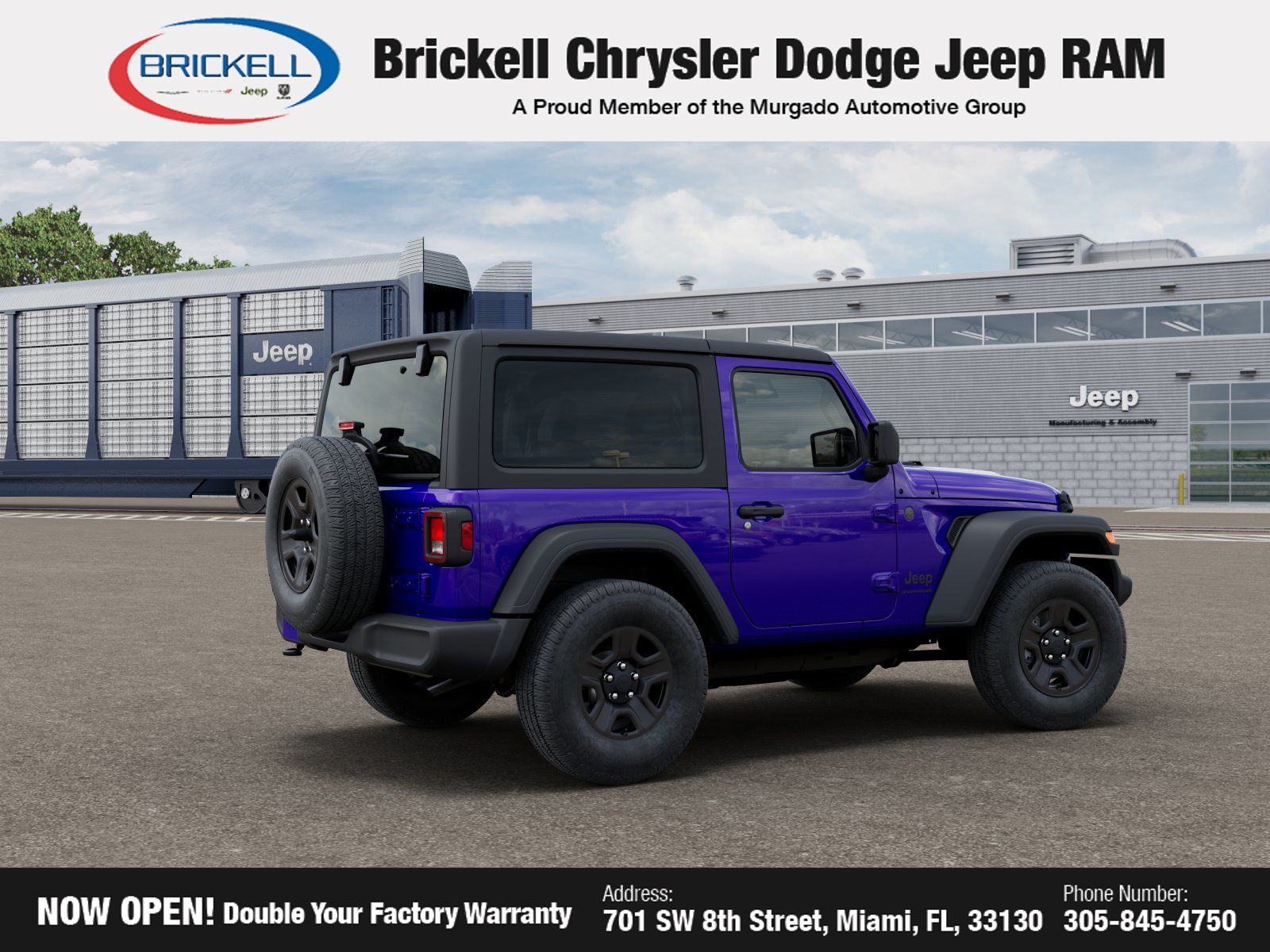 Discover Your Next Vehicle at Brickell Chrysler Dodge Jeep Ram. Welcome to Brickell CDJR, where we go beyond selling cars. We double the factory powertrain warranty, giving you added peace of mind. Our dealership offers one of the largest new car inventories in the region, ensuring you find the right vehicle. Prices displayed do not include our Perma-plate. Our state-of-the-art service department is the largest in the country and is open seven days a week from 7 AM to 9 PM. Visit us at 701 SW 8th St, Miami, FL 33130, or call 305-777-2800 to learn more and schedule a test drive. The displayed price includes an incentive for financing with Brickell CDJR Finance Company. Outside financing and bank drafts are not accepted. All pre-owned vehicle exports are subject to an export fee. Prices apply only to customers who live, work, or worship in Broward, Miami-Dade, Palm Beach, Monroe, Collier, Hendry, Lee, Glades, Martin, St. Lucie, Okeechobee, Manatee, Hillsborough, Osceola, or Orange County. Customers outside these counties will pay an additional $ Taxes, title, registration, and dealer fees apply.