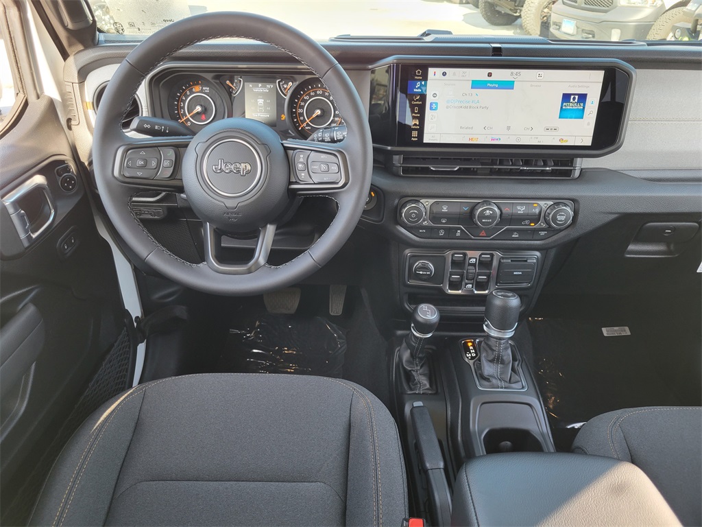 2026 Jeep Wrangler 3.6L V6 engine, 4WD, and a full-size rear window. This Sport S model features a 4-door body style with a Bright White Clear-Coat exterior and a Black interior. The vehicle is equipped with an electronic touchscreen display, a 12.3-inch touchscreen display, and a full-size rear window. The vehicle features a manual transmission with automatic transmission, and the vehicle is ready for sale at the dealership.