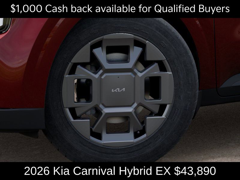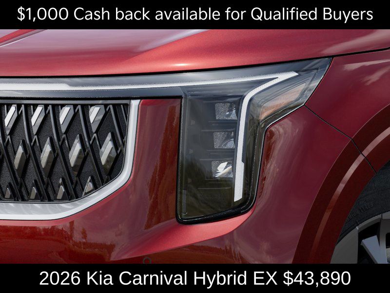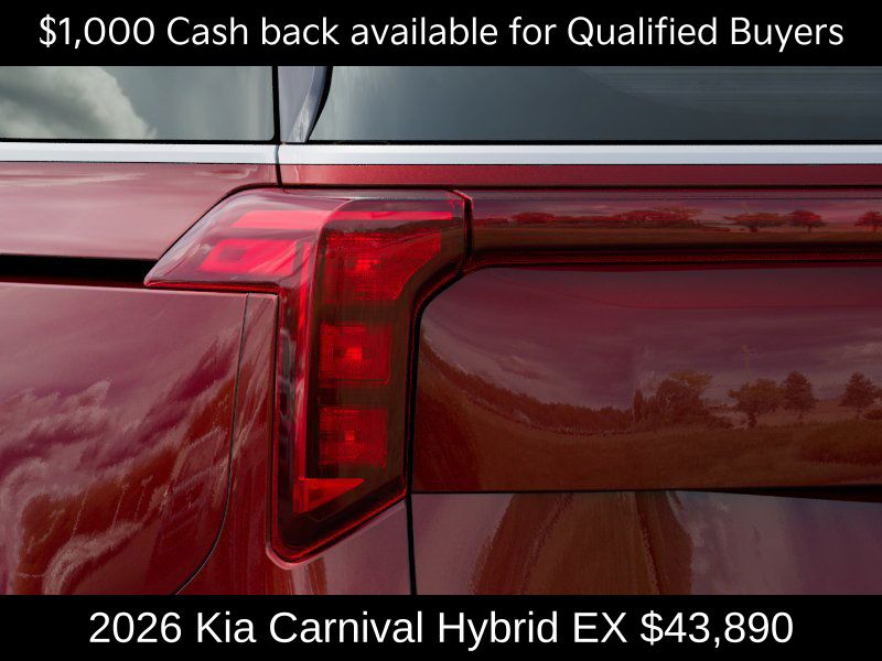 Kia Store Elizabethtown is delighted to offer this charming 2026 Kia Carnival Hybrid EX in Flare Red. Well equipped with: 3rd row seats: split-bench, 4-Wheel Disc Brakes, 8 Speakers, ABS brakes, Air Conditioning, Alloy wheels, AM/FM radio: SiriusXM, Apple CarPlay & Android Auto, Artificial Leather Seat Trim, Auto High-beam Headlights, Automatic temperature control, Brake assist, Bumpers: body-color, Compass, Delay-off headlights, Driver door bin, Driver vanity mirror, Dual front impact airbags, Dual front side impact airbags, Electronic Stability Control, Emergency communication system, Exterior Parking Camera Rear, Four wheel independent suspension, Front anti-roll bar, Front Bucket Seats, Front Center Armrest, Front dual zone A/C, Front reading lights, Fully automatic headlights, Heated door mirrors, Heated Front Bucket Seats, Heated front seats, Illuminated entry, Knee airbag, Leather Shift Knob, Leather steering wheel, Low tire pressure warning, Memory seat, Navigation System, Occupant sensing airbag, Outside temperature display, Overhead airbag, Overhead console, Panic alarm, Passenger door bin, Passenger vanity mirror, Power door mirrors, Power driver seat, Power Liftgate, Power passenger seat, Power steering, Power windows, Radio: Navigation System w/SiriusXM, Rear air conditioning, Rear anti-roll bar, Rear reading lights, Rear window defroster, Rear window wiper, Reclining 3rd row seat, Remote keyless entry, Security system, Speed control, Speed-sensing steering, Split folding rear seat, Spoiler, Steering wheel mounted audio controls, Tachometer, Telescoping steering wheel, Tilt steering wheel, Traction control, Trip computer, Turn signal indicator mirrors, Variably intermittent wipers, and Wheels: 19" Black Alloy. Price includes: $1000 - KFA Dealer Choice Program: $1000 discount and 5.25% APR for 36 months. $30.08 per $1000 financed. Available to well qualified buyers who finance through Kia Finance America. 506. Exp. 02/02/2026