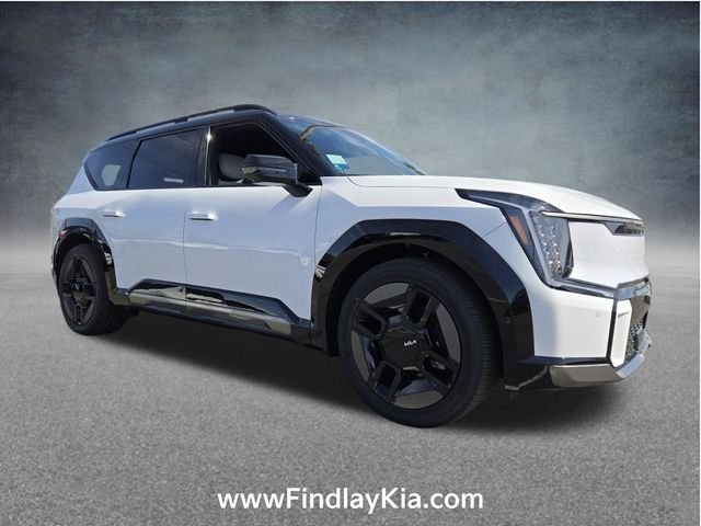 Welcome to Findlay Kia on Sahara Ave in Las Vegas. This EV9 is equipped with the following options: Two-Tone Roof Package (Ebony Black Roof), 14 Speakers, 3rd row seats: split-bench, 4-Wheel Disc Brakes, ABS brakes, Air Conditioning, Alloy wheels, AM/FM radio: SiriusXM, Apple CarPlay & Android Auto, Auto High-beam Headlights, Auto-dimming door mirrors, Auto-dimming Rear-View mirror, Auto-leveling suspension, Automatic temperature control, Brake assist, Bumpers: body-color, Cargo Net, Carpeted Floor Mat, 6-Passenger, Delay-off headlights, Driver door bin, Driver vanity mirror, Dual front impact airbags, Dual front side impact airbags, Electronic Stability Control, Emergency communication system: 911 Connect, Exterior Parking Camera Rear, Four wheel independent suspension, Front anti-roll bar, Front Bucket Seats, Front Center Armrest w/Storage, Front dual zone A/C, Front reading lights, Fully automatic headlights, Garage door transmitter: HomeLink, Heads-Up Display, Heated and Ventilated Front Bucket Seats, Heated door mirrors, Heated front seats, Heated rear seats, Heated steering wheel, Illuminated entry, Knee airbag, Low tire pressure warning, Memory seat, Navigation System, Occupant sensing airbag, Outside temperature display, Overhead airbag, Overhead console, Panic alarm, Passenger door bin, Passenger vanity mirror, Power door mirrors, Power driver seat, Power Liftgate, Power moonroof, Power passenger seat, Power steering, Power windows, Radio data system, Radio: AM/FM/HD /SiriusXM, Rain sensing wipers, Rear air conditioning, Rear anti-roll bar, Rear reading lights, Rear seat center armrest, Rear window defroster, Rear window wiper, Reclining 3rd row seat, Remote keyless entry, Security system, Small First Aid Kit, Speed control, Speed-sensing steering, Split folding rear seat, Spoiler, Steering wheel memory, Steering wheel mounted audio controls, Telescoping steering wheel, Tilt steering wheel, Traction control, Trip computer, Turn signal indicator mirrors, Variably intermittent wipers, Ventilated front seats, Ventilated rear seats.