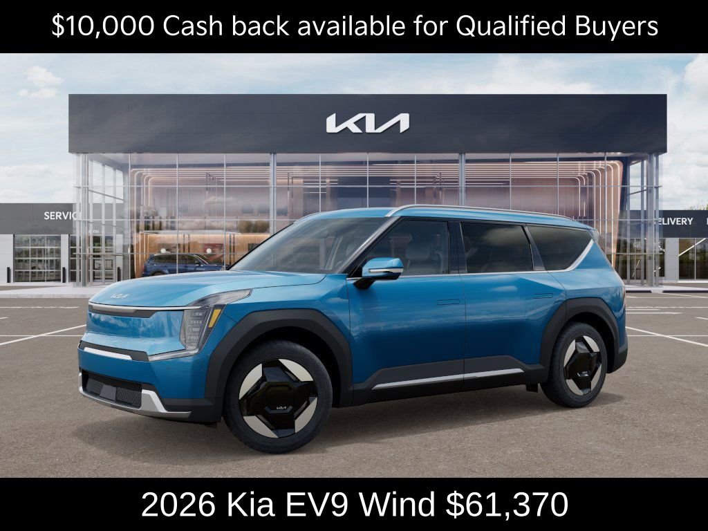 $9,000 off MSRP! Kia Store Elizabethtown is excited to offer this good-looking 2026 Kia EV9 Wind in Ocean Blue. Well equipped with: 3rd row seats: split-bench, 4-Wheel Disc Brakes, 8 Speakers, ABS brakes, Air Conditioning, Alloy wheels, AM/FM radio, Apple CarPlay & Android Auto, Auto High-beam Headlights, Auto-dimming Rear-View mirror, Automatic temperature control, Brake assist, Bumpers: body-color, Cargo Net, Carpeted Floor Mat, 7-Passenger, Delay-off headlights, Driver door bin, Driver vanity mirror, Dual front impact airbags, Dual front side impact airbags, Electronic Stability Control, Emergency communication system: 911 Connect, Exterior Parking Camera Rear, Four wheel independent suspension, Front anti-roll bar, Front Bucket Seats, Front Center Armrest w/Storage, Front dual zone A/C, Front reading lights, Full SynTex Leather Seat Trim, Fully automatic headlights, Garage door transmitter: HomeLink, Heated & Ventilated Front Bucket Seats, Heated door mirrors, Heated front seats, Heated steering wheel, Illuminated entry, Knee airbag, Low tire pressure warning, Memory seat, Mud Guards, Navigation System, Occupant sensing airbag, Outside temperature display, Overhead airbag, Overhead console, Panic alarm, Passenger door bin, Passenger vanity mirror, Power door mirrors, Power driver seat, Power Liftgate, Power moonroof, Power passenger seat, Power steering, Power windows, Radio data system, Radio: AM/FM/HD Radio/SiriusXM, Rain sensing wipers, Rear air conditioning, Rear anti-roll bar, Rear reading lights, Rear seat center armrest, Rear window defroster, Rear window wiper, Reclining 3rd row seat, Remote keyless entry, Security system, Speed control, Speed-sensing steering, Split folding rear seat, Spoiler, Steering wheel memory, Steering wheel mounted audio controls, Telescoping steering wheel, Tilt steering wheel, Traction control, Trip computer, Turn signal indicator mirrors, Variably intermittent wipers, Ventilated front seats.