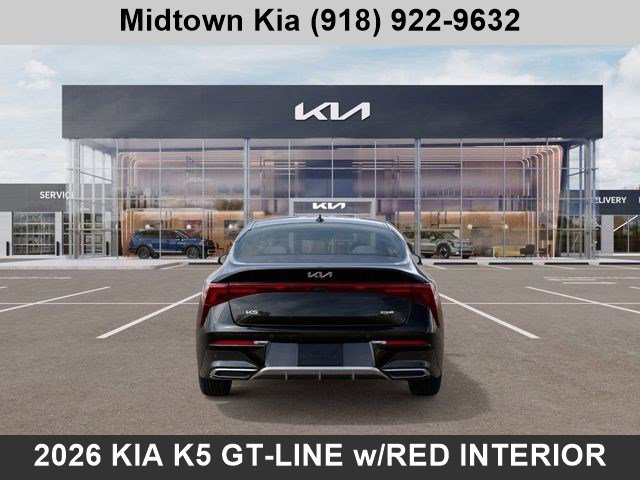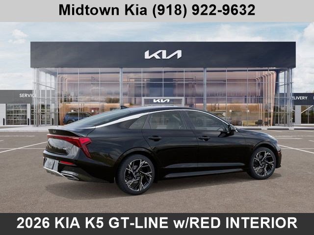 Recent Arrival! 2026 Kia K5 GT-Line for sale Tulsa OK. 25/36 City/Highway MPG Financing is available for everyone. I4 8-Speed Automatic FWD. If you're searching for the new 2026 Kia K5 for Sale in Tulsa or Broken Arrow, OK, then this 2026 K5 GT-Line might just be the perfect Sedan for you. Located at our Kia dealership in Tulsa, this Aurora Black Pearl Kia K5 is a New 2026 Kia K5 GT-Line FWD Sedan, and is complimented with a beautiful, Red interior SynTex seat trim. Don't Miss Out! Contact one of your friendly consultants today at Midtown Kia of Tulsa, for complete details on this new 2026 Kia K5. Tulsa Kia clients are always invited to discover our convenient and hassle-free car-buying experience at Midtown Kia of Tulsa. Midtown Kia of Tulsa is dedicated to your satisfaction before, during, and after your purchase. We'll go the extra mile to take care of you.