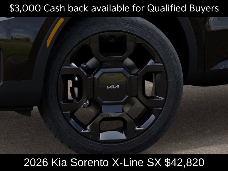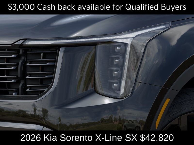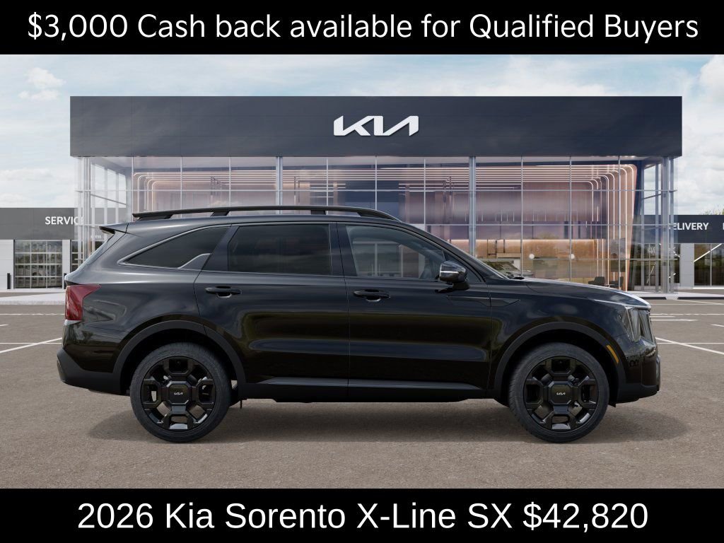 $3,000 off MSRP! Priced below KBB Fair Purchase Price! Kia Store Elizabethtown is pumped up to offer this beautiful 2026 Kia Sorento X-Line SX in Ebony Black. Well equipped with: 12 Speakers, 3rd row seats: split-bench, 4-Wheel Disc Brakes, ABS brakes, Air Conditioning, Alloy wheels, AM/FM radio: SiriusXM, Apple CarPlay & Android Auto, Auto High-beam Headlights, Auto-dimming Rear-View mirror, Automatic temperature control, Brake assist, Bumpers: body-color, Carpeted Floor Mats, Delay-off headlights, Driver door bin, Driver vanity mirror, Dual front impact airbags, Dual front side impact airbags, Electronic Stability Control, Emergency communication system: 911 Connect, Exterior Parking Camera Rear, Four wheel independent suspension, Front anti-roll bar, Front Bucket Seats, Front Center Armrest, Front dual zone A/C, Front fog lights, Front reading lights, Fully automatic headlights, Garage door transmitter: HomeLink, Heated and Ventilated Front Bucket Seats, Heated door mirrors, Heated front seats, Heated steering wheel, Illuminated entry, Knee airbag, Leather Shift Knob, Leather steering wheel, Low tire pressure warning, Navigation System, Occupant sensing airbag, Outside temperature display, Overhead airbag, Overhead console, Panic alarm, Passenger door bin, Passenger vanity mirror, Power door mirrors, Power driver seat, Power Liftgate, Power moonroof, Power passenger seat, Power steering, Power windows, Radio data system, Radio: AM/FM Bose Premium Audio System, Rain sensing wipers, Rear anti-roll bar, Rear reading lights, Rear side impact airbag, Rear window defroster, Rear window wiper, Remote keyless entry, Security system, Speed control, Speed-sensing steering, Split folding rear seat, Spoiler, Steering wheel mounted audio controls. Price includes $3000 - KFA Dealer Choice Program: $3000 discount and 5.25% APR for 36 months. $30.08 per $1000 financed. Available to well qualified buyers who finance through Kia Finance America.
