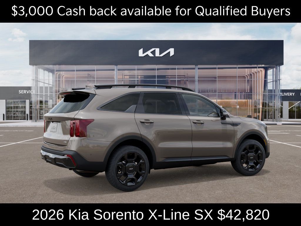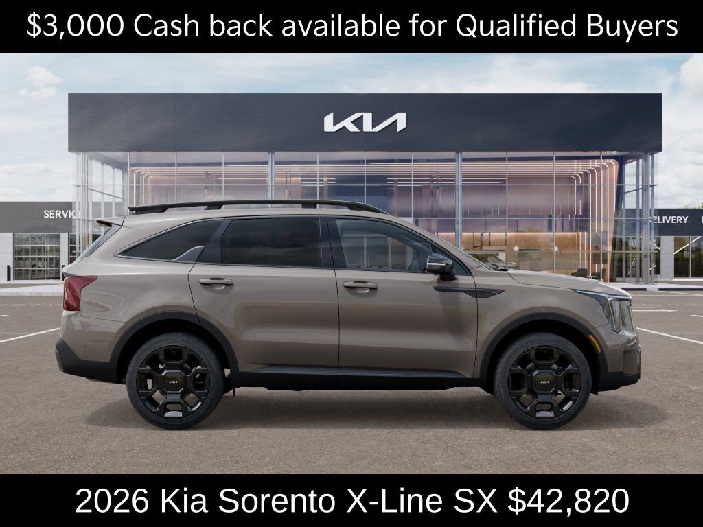 $3,000 off MSRP! Priced below KBB Fair Purchase Price! Kia Store Elizabethtown is pumped up to offer this superb 2026 Kia Sorento X-Line SX in Road Rider Brown. Well equipped with: 12 Speakers, 3rd row seats: split-bench, 4-Wheel Disc Brakes, ABS brakes, Air Conditioning, Alloy wheels, AM/FM radio: SiriusXM, Apple CarPlay & Android Auto, Auto High-beam Headlights, Auto-dimming Rear-View mirror, Automatic temperature control, Brake assist, Bumpers: body-color, Carpeted Floor Mats, Delay-off headlights, Driver door bin, Driver vanity mirror, Dual front impact airbags, Dual front side impact airbags, Electronic Stability Control, Emergency communication system: 911 Connect, Exterior Parking Camera Rear, Four wheel independent suspension, Front anti-roll bar, Front Bucket Seats, Front Center Armrest, Front dual zone A/C, Front fog lights, Front reading lights, Fully automatic headlights, Garage door transmitter: HomeLink, Heated and Ventilated Front Bucket Seats, Heated door mirrors, Heated front seats, Heated steering wheel, Illuminated entry, Knee airbag, Leather Shift Knob, Leather steering wheel, Low tire pressure warning, Navigation System, Occupant sensing airbag, Outside temperature display, Overhead airbag, Overhead console, Panic alarm, Passenger door bin, Passenger vanity mirror, Power door mirrors, Power driver seat, Power Liftgate, Power moonroof, Power passenger seat, Power steering, Power windows, Radio data system, Radio: AM/FM Bose Premium Audio System, Rain sensing wipers, Rear anti-roll bar, Rear reading lights, Rear side impact airbag, Rear window defroster, Rear window wiper, Remote keyless entry, Security system, Speed control, Speed-sensing steering, Split folding rear seat, Spoiler, Steering wheel mounted audio controls. Price includes: $3000 - KFA Dealer Choice Program: $3000 discount and 5.25% APR for 36 months. $30.08 per $1000 financed. Available to well qualified buyers who finance through Kia Finance America. 506. Exp. 03/31/2026.